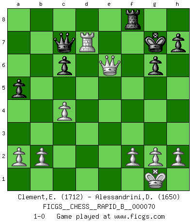 Last move : 1-0 2008 January 30 18:35:51 [Event "FICGS__CHESS__RAPID_B__000070"] [Site "FICGS"] [Date "2007.10.07"] [Round "1"] [White "Clement,Etienne"] [Black "Alessandrini,Daniele"] [Result "1-0"] [WhiteElo "1712"] [BlackElo "1650"] 1.Nf3 Nf6 2.c4 g6 3.Nc3 Bg7 4.d4 O-O 5.e4 d6 6.Be3 e5 7.d5 Nbd7 8.Qd2 Nc5 9.Bd3 Ne8 10.Bc2 a5 11.Bh6 f5 12.exf5 Bxf5 13.Be3 Bxc2 14.Qxc2 Nf6 15.Bxc5 dxc5 16.O-O Qd6 17.Ng5 c6 18.Nge4 Qd7 19.d6 Ne8 20.Na4 Rd8 21.Rad1 Qf5 22.Qe2 Rf7 23.Naxc5 Bf8 24.d7 Nf6 25.Nxb7 R8xd7 26.Nbd6 Bxd6 27.Nxd6 Rxd6 28.Rxd6 Qc8 29.Qxe5 Qc7 30.Rfd1 Rf8 31.Qe6+ Kg7 32.Rd7+ Nxd7 33.Rxd7+ 1-0 Reti Opening Kingside Castling by player Black (move 4) Kingside Castling by player White (move 16) Player White won this chess game. Follow this game move after move (download)Live, lose, and learn, by observing your opponent how to win. (Amber Steenbock) Ich würde die 30 stärksten Spieler der USA im Simultanspiel besiegen. (José Raúl Capablanca) En posiciones complicadas, Bobby Fischer pocas veces tuvo que temer de cualquiera. (Paul Keres) A ce moment-là, je menaçais de comprendre la position ! (Clément L'Heureux) Experiences are the keys to life. (Daniel Parmet)