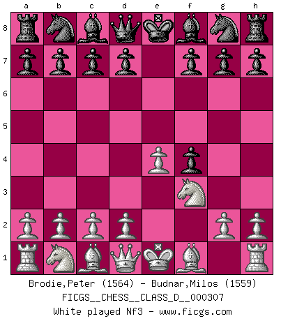 Last move : 0-1 2026 January 23 19:59:4 [Event "FICGS__CHESS__CLASS_D__000307"] [Site "FICGS"] [Date "2025.10.27"] [Round "1"] [White "Brodie,Peter"] [Black "Budnar,Milos"] [Result "0-1"] [WhiteElo "1564"] [BlackElo "1559"] 1.e4 e5 2.f4 exf4 3.Nf3 f6 4.Bc4 d6 5.Nc3 Bg4 6.d3 h5 7.h3 Bxf3 8.Qxf3 g5 9.Bd2 a6 10.O-O-O Nc6 11.Ne2 Qe7 12.Bc3 O-O-O 13.Bd5 Qd7 14.Bxc6 Qxc6 15.Nd4 Qd7 16.Rhe1 Nh6 17.Nf5 Qf7 18.Nxh6 Rxh6 19.d4 Qxa2 20.b3 b5 21.Qe2 d5 22.Kd2 Qa3 23.Ra1 Qd6 24.e5 fxe5 25.dxe5 Qe6 26.Bd4 c5 27.Bf2 d4 28.Qd3 Bg7 29.Qe4 Kb8 30.Kc1 Rd5 31.c4 Rxe5 32.Qf3 Rxe1 33.Bxe1 Qxe1 34.Kb2 d3 35.Ka3 Qxa1 0-1 Follow this game move after move (download)Chess is as much a mystery as women. (Purdy) Im Wettkampf zwischen starken Meistern kommen Fehler sehr selten vor, deshalb ist es mit bloßem Warten nicht getan. (José Raúl Capablanca) No es suficiente ser un buen jugador, se debe también de jugar bién. (Siegbert Tarrasch) Toute estimation doit être constamment réévaluée. (Jacob Estrin) If we don't succeed, we run the risk of failure. (George W. Bush)