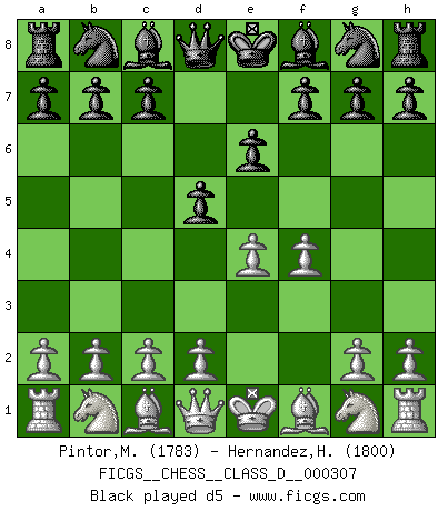 Last move : 0-1 2025 November 23 5:49:28 [Event "FICGS__CHESS__CLASS_D__000307"] [Site "FICGS"] [Date "2025.10.27"] [Round "1"] [White "Pintor,Manuel"] [Black "Hernandez,Humberto"] [Result "0-1"] [WhiteElo "1783"] [BlackElo "1800"] 1.e4 e6 2.f4 d5 3.exd5 exd5 4.Nf3 c5 5.d4 Nf6 6.Bb5+ Nc6 7.O-O Be7 8.Ne5 Qb6 9.Bxc6+ bxc6 10.c3 O-O 11.b3 Ba6 12.Rf2 Rfe8 13.h3 Ne4 14.Rf3 cxd4 15.Kh2 f6 16.Ng4 h5 17.Nf2 Nxf2 18.Rxf2 dxc3 19.Rc2 d4 20.Nxc3 dxc3 21.Rxc3 Bb4 22.Rg3 Re1 0-1 Follow this game move after move (download)When I asked Fischer why he had not played a certain move in our game, he replied: 'Well, you laughed when I wrote it down !' (Mikhail Tal) Wer sich die Fähigkeit anerziehen will im Schach selbstständig zu denken, der muß alles meiden, was leblos ist: ausgeklügelte Theorien, die sich auf sehr wenige Beispiele und eine Menge Hirngespinste stützen. (Emanuel Lasker) A través de las casillas del tablero, los Indios explican el movimiento del tiempo y la edad, las influencias mas altas que controlan el mundo y los lazos que vinculan al Ajedrez con el alma humana. (Al-Masudi) L'action d'une oeuvre littéraire se déroule sur un champ de bataille. Les masques et les types du drame moderne correspondent aux pièces du jeu d'échecs. L'intrigue correspond aux coups et aux gambits, c'est à dire aux techniques du jeu telles qu'utilisées et interprétées par les joueurs. Les tactiques et les péripéties [mouvements] correspondent aux coups exécutés par l'adversaire. (Viktor Shklovsky) When it is a question of money, everybody is of the same religion. (Voltaire)