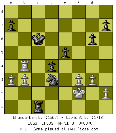 Last move : 0-1 2007 December 5 13:51:35 [Event "FICGS__CHESS__RAPID_B__000070"] [Site "FICGS"] [Date "2007.10.07"] [Round "1"] [White "Bhandarkar,Dinesh"] [Black "Clement,Etienne"] [Result "0-1"] [WhiteElo "1567"] [BlackElo "1712"] 1.e4 e5 2.d4 exd4 3.c3 dxc3 4.Nxc3 c6 5.Bc4 b5 6.Bb3 d6 7.Nf3 Be7 8.O-O Be6 9.Bxe6 fxe6 10.Qb3 Qd7 11.Nd4 e5 12.Nf5 g6 13.Ng7+ Kd8 14.Ne6+ Kc8 15.Be3 Na6 16.Rac1 Nf6 17.Nxb5 Nxe4 18.Qc2 d5 19.Qxc6+ Qxc6 20.Rxc6+ Kb7 21.Rxa6 Kxa6 22.Nbc7+ Kb7 23.Nxa8 Rxa8 24.f3 Nd6 25.Rc1 Nc4 26.Bf2 Rc8 27.b3 Nb6 28.Nc5+ Bxc5 29.Bxc5 d4 30.Kf2 Nd5 31.a3 Nf4 32.Rc4 Rxc5 33.Rb4+ Kc6 34.g3 Rc2+ 35.Kf1 Rc1+ 36.Kf2 Nd3+ 0-1 Danish gambit Kingside Castling by player White (move 8) Player Black won this chess game. Follow this game move after move (download)When you are lonely, when you feel yourself an alien in the world, play Chess. This will raise your spirits and be your counselor in war. (Aristotle) Gegen einen Schachcomputer zu verlieren ist wie Löcher in den Strümpfen zuhaben. Es ist nicht peinlich, solange man der einzige ist der es weiß. (Anonymous) El arma más poderosa en el Ajedrez, es tener la próxima movida. (David Bronstein) Les erreurs sont comme les malheurs, elles n'arrivent jamais seules. (Siegbert Tarrasch) Treat your password like your toothbrush. Don't let anybody else use it, and get a new one every six months. (Clifford Stoll)