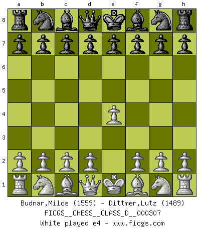 Last move : 1-0 2025 December 7 20:12:38 [Event "FICGS__CHESS__CLASS_D__000307"] [Site "FICGS"] [Date "2025.10.27"] [Round "1"] [White "Budnar,Milos"] [Black "Dittmer,Lutz"] [Result "1-0"] [WhiteElo "1559"] [BlackElo "1489"] 1.e4 g6 2.h3 1-0 This chess game has been lost on time (started : 2025.10.27 18:41:4) Follow this game move after move (download)The game of chess is the touchstone of the intellect. (Goethe) Ich war zu klein für die Schach-Schülermannschaft! (Woody Allen) Sin errores no puede haber brillantez. (Emanuel Lasker) La guerre est enfant de la passion, la passion est enfant du narcissisme et le narcissisme est l'enfant. (...) Une autre partie ? (Thibault de Vassal) The large trees attract high winds. (Chinese proverb)