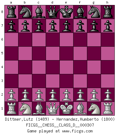 Last move : 0-1 2025 December 7 20:12:38 [Event "FICGS__CHESS__CLASS_D__000307"] [Site "FICGS"] [Date "2025.10.27"] [Round "1"] [White "Dittmer,Lutz"] [Black "Hernandez,Humberto"] [Result "0-1"] [WhiteElo "1489"] [BlackElo "1800"] 1.d4 d5 0-1 This chess game has been lost on time (started : 2025.10.27 18:41:4) Follow this game move after move (download)There is no remorse like the remorse of Chess. (H. G. Wells) Ich kämpfe solange mein Gegner einen Fehler machen kann. (Emanuel Lasker) Aunque la mayoría de la gente disfruta observar las partidas de los grandes Maestros de ataque, algunos de los jugadores mas notables en la historia han sido los jugadores silenciosos posicionales. Lentamente ellos te aplastan despojandote de tu espacio, congestionando tus piezas y dejandote virtualmente sin nada que hacer. (Yasser Seirawan) La vie et les Echecs sont tous les deux une lutte constante. (Lasker) Knowledge rests not upon truth alone, but upon error also. (Carl G. Jung)