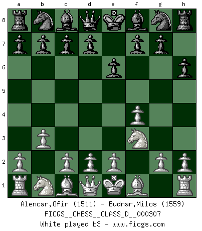 Last move : 0-1 2025 December 17 8:50:3 [Event "FICGS__CHESS__CLASS_D__000307"] [Site "FICGS"] [Date "2025.10.27"] [Round "1"] [White "Alencar,Ofir"] [Black "Budnar,Milos"] [Result "0-1"] [WhiteElo "1511"] [BlackElo "1559"] 1.f4 e6 2.Nf3 h6 3.b3 Bb4 4.Ba3 Bxa3 5.Nxa3 Nf6 6.e3 O-O 7.Nc4 d5 8.Nce5 Nbd7 9.Nxd7 Bxd7 10.Ne5 a6 11.Nxd7 Qxd7 12.h3 Ne4 13.d3 Ng3 14.Rg1 Nxf1 15.Kxf1 d4 16.exd4 Qxd4 17.Rb1 Qxf4+ 18.Qf3 Qd2 19.Qd1 Qf4+ 20.Qf3 Qxf3 21.gxf3 f5 22.Kf2 Rad8 23.Rge1 Rf6 24.Re2 Kf7 25.Re5 Rd5 26.Rxd5 exd5 27.c4 dxc4 28.dxc4 c5 29.Rd1 b6 30.Rd7+ Kg6 31.Ra7 a5 32.Rb7 h5 33.a3 Kh6 34.b4 axb4 35.axb4 cxb4 36.Ke2 g5 37.Kd2 h4 38.Re7 f4 39.Re1 Rd6 40.Kc2 Rc6 41.Re4 b5 42.Kb3 Rxc4 43.Rxc4 bxc4 44.Kxc4 g4 45.fxg4 f3 0-1 Follow this game move after move (download)You need not play well - just help your opponent to play badly. (Genrikh Chepukaitis) Ich habe kein Problem mit Frauen, sondern nur mit dem Niveau ihres Schachspiels (Judith Polgar) Si no le temes a Spassky, entonces elimino el elemento del dinero. (Jim Slater) Le profane ne songe pas à la somme de jouissance dont il se prive, qui méconnaît ce jeu aux ressources aussi variées que passionnantes. (Jean-Marie Jeanton-Lamarche) Being number two sucks. (Andre Agassi)