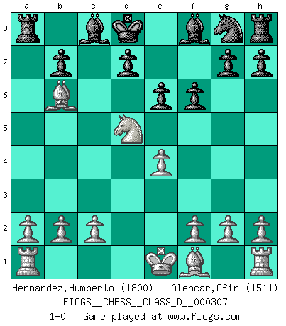 Last move : 1-0 2025 October 30 10:41:40 [Event "FICGS__CHESS__CLASS_D__000307"] [Site "FICGS"] [Date "2025.10.27"] [Round "1"] [White "Hernandez,Humberto"] [Black "Alencar,Ofir"] [Result "1-0"] [WhiteElo "1800"] [BlackElo "1511"] 1.e4 c5 2.Nf3 Nc6 3.d4 Nxd4 4.Nxd4 cxd4 5.Qxd4 Qb6 6.Qxb6 axb6 7.Nc3 f6 8.Nd5 Kd8 9.Be3 e6 10.Bxb6+ 1-0 Follow this game move after move (download)The tactician knows what to do when there is something to do; whereas the strategian knows what to do when there is nothing to do. (Gerald Abrahams) Gewöhnliche Menschen denken nur daran, wie sie ihre Zeit verbringen. Ein intelligenter Mensch versucht, sie auszunutzen. (Arthur Schopenhauer) No es suficiente ser un buen jugador, se debe también de jugar bién. (Siegbert Tarrasch) Ne tendez aucun piège pour le plaisir ! Ne jouez rien dans l'espoir que l'adversaire réagisse de façon stupide ! Prenez toujours pour acquis que l'adversaire va trouver le meilleur coup ! Ne jouez jamais de coup dans l'espoir que l'adversaire ne voie pas la menace ! Chacun de vos coups doit améliorer la position d'une façon ou d'une autre. We cannot be sure of having something to live for unless we are willing to die for it. (Ernesto Che Guevara)