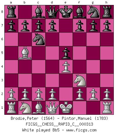 Last move : 0-1 2026 January 1 22:33:25 [Event "FICGS__CHESS__RAPID_C__000313"] [Site "FICGS"] [Date "2025.10.27"] [Round "1"] [White "Brodie,Peter"] [Black "Pintor,Manuel"] [Result "0-1"] [WhiteElo "1564"] [BlackElo "1783"] 1.e4 e5 2.Nf3 Nc6 3.Bb5 Bc5 4.Bxc6 dxc6 5.Nc3 f6 6.d3 Ne7 7.Be3 Bxe3 8.fxe3 O-O 9.O-O Ng6 10.h3 Qe8 11.Qd2 Ne7 12.d4 exd4 13.exd4 Qg6 14.Nh4 Qg3 15.Nf3 Bxh3 16.Rf2 Ng6 0-1 This chess game has been lost on time (started : 2025.10.27 19:0:53) Follow this game move after move (download)I love all positions. Give me a difficult positional game, I will play it. But totally won positions, I cannot stand them. (Hein Donner) Wenn Dein Gegner dir ein Remis anbietet, versuch herauszufinden, weshalb er glaubt schlechter zu stehen. (Nigel Short) Al jugar al Ajedrez entonces, podemos aprender: Primero: Previsión... Segundo: Prudencia... Tercero: Cautela... Y al final, aprendemos del Ajedrez el hábito de no ser desanimados por apariencias malas presentes en el estado de nuestros asuntos, el hábito de la esperanza por una oportunidad favorable y la perseveración de los secretos de los recursos. (Benjamin Franklin) Il vaut toujours mieux jouer un plan faux de façon logique que de n'avoir pas de plan du tout. (Victor Kortchnoï) There are two major products that came out of Berkeley: LSD and UNIX. We do not believe this is to be a coincidence. (Jeremy S. Anderson)