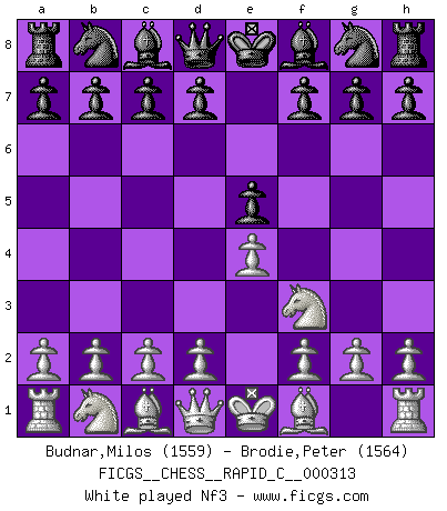 Last move : 1-0 2025 December 31 3:18:59 [Event "FICGS__CHESS__RAPID_C__000313"] [Site "FICGS"] [Date "2025.10.27"] [Round "1"] [White "Budnar,Milos"] [Black "Brodie,Peter"] [Result "1-0"] [WhiteElo "1559"] [BlackElo "1564"] 1.e4 e5 2.Nf3 Nc6 3.Bb5 h6 4.O-O Nf6 5.d3 Be7 6.h3 O-O 7.Bxc6 dxc6 8.Nxe5 Bd6 9.Bf4 Bxe5 10.Bxe5 Nd7 11.Bg3 Re8 12.Qg4 Qg5 13.Qxg5 hxg5 14.Nd2 Ne5 15.f4 gxf4 16.Bxf4 f6 17.Bxe5 fxe5 18.Rf3 Bd7 19.Raf1 1-0 This chess game has been lost on time (started : 2025.10.27 19:0:53) Follow this game move after move (download)When in doubt... play Chess ! (Tevis) Die westlichen Werte sind eine Sprache, welche die Putin-Administration nicht versteht. (Garry Kasparov) El Ajedrez se juega con la mente... ¡no con las manos!. (Renaud y Kahn) Vouloir jouer aux échecs contre soi-même est aussi paradoxal que vouloir marcher sur son ombre. (Stefan Zweig) I fear not the man who has practiced 10,000 kicks once, but I fear the man who has practiced one kick 10,000 times. (Bruce Lee)