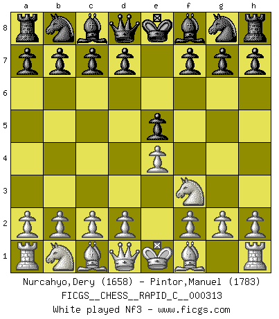 Last move : 1/2-1/2 2026 February 13 23:12:7 [Event "FICGS__CHESS__RAPID_C__000313"] [Site "FICGS"] [Date "2025.10.27"] [Round "1"] [White "Nurcahyo,Dery"] [Black "Pintor,Manuel"] [Result "1/2-1/2"] [WhiteElo "1658"] [BlackElo "1783"] 1.e4 e5 2.Nf3 Nc6 3.c3 Bc5 4.Bc4 Qf6 5.d4 exd4 6.Bg5 Qg6 7.Bd3 dxc3 8.Nxc3 Ne5 9.Nd5 Nxf3+ 10.Qxf3 Bb6 11.Be3 Nf6 12.Bxb6 Nxd5 13.exd5 Qxb6 14.Qe2+ Kd8 15.O-O Re8 16.Qc2 g6 17.Rac1 c6 18.d6 Re6 19.Bc4 Rxd6 20.Bxf7 Rf6 21.Bg8 h6 22.Bb3 d5 23.Rce1 Bf5 24.Qc3 Rf8 25.Qg7 Qc5 26.Re3 b5 27.Qxh6 Kc7 28.Qg7+ Kb6 29.Rc3 Qd6 30.Qd4+ Ka6 31.f3 Kb7 32.Re1 Rae8 33.Rce3 Rxe3 34.Rxe3 Rf7 35.a3 Re7 36.g4 Rxe3 37.Qxe3 Bd7 38.Qd4 a5 39.Bc2 c5 40.Qg7 Kb6 41.Bxg6 Bc6 42.Kg2 b4 43.Bc2 d4 44.Qg5 c4 45.h4 d3 46.Bd1 Qd4 47.axb4 Qxb2+ 48.Kg3 axb4 49.Qe3+ Kb5 50.Qg5+ Kb6 51.Qd8+ Kc5 52.Qa5+ Kd4 53.Qd8+ Kc5 54.Qe7+ Kb5 55.Qg5+ Kb6 1/2-1/2 Follow this game move after move (download)Chess is a beautiful mistress. (Bent Larsen) Glücklicherweise sind Großmeister Ruben Fines reine Schachbücher weniger phallozentrisch [als seine Schachpsychologie] und deswegen auch weniger lächerlich. (Nigel Short) Si yo gano un torneo, yo lo gano por mí mismo. Yo hago las jugadas. Nadie me ayuda. (Bobby Fischer) La victoire dans une partie d'Echecs appartient la plupart du temps à celui qui voit un peu plus loin que l'adversaire. (Lasker) I feel so... helpless. (C-3PO in Star Wars ep.3)