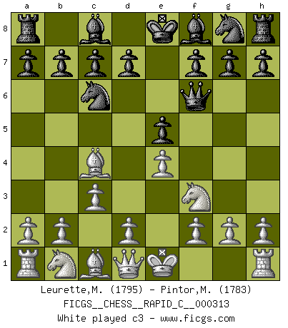 Last move : 0-1 2026 January 20 16:45:2 [Event "FICGS__CHESS__RAPID_C__000313"] [Site "FICGS"] [Date "2025.10.27"] [Round "1"] [White "Leurette,Marc-Antoine"] [Black "Pintor,Manuel"] [Result "0-1"] [WhiteElo "1795"] [BlackElo "1783"] 1.e4 e5 2.Nf3 Nc6 3.Bc4 Qf6 4.c3 Bc5 5.b4 Bb6 6.a4 a6 7.a5 Ba7 8.d3 h6 9.O-O d6 10.Re1 Be6 11.Bd5 Qg6 12.Be3 Bxe3 13.Rxe3 Nf6 14.Bxe6 fxe6 15.Nbd2 O-O 16.Nh4 Qg5 17.Ndf3 Qg4 18.h3 Qh5 19.g4 Qf7 20.Nh2 g5 21.Ng2 Qg6 22.f3 d5 23.Qb3 Kg7 24.b5 axb5 25.Qxb5 Nd8 26.a6 bxa6 27.Rxa6 Rxa6 28.Qxa6 d4 29.cxd4 exd4 30.Re1 h5 31.Qc4 e5 32.Qxc7+ Nf7 33.Rb1 Ne8 34.Qc5 h4 35.Rb7 Qd6 36.Qb5 Kg8 37.Rb6 Qc7 38.Qb1 Qc3 39.f4 exf4 40.Nf3 Ng7 41.Qb2 Qxd3 42.Nxd4 Qxe4 43.Nf3 Ne6 44.Qb3 Re8 45.Nd2 Qd4+ 46.Kf1 Qe5 47.Nf3 Qe4 48.Nd2 Qe5 49.Nf3 Qa1+ 50.Nge1 Qf6 51.Nd3 Kg7 52.Kf2 Qe7 53.Qb2+ Kf8 54.Nde5 Qc5+ 55.Kf1 Qd5 56.Ng6+ Kg8 57.Kg2 Nc5 58.Rb8 Rxb8 59.Qxb8+ Kg7 60.Ne7 Qa2+ 61.Kh1 Ne4 62.Qg8+ Kf6 63.Qg6+ Kxe7 64.Qxe4+ Qe6 65.Qb4+ Qd6 66.Qe4+ Qe6 67.Qb7+ Kf6 68.Qb2+ Ne5 69.Kg2 Qd5 70.Qb6+ Ke7 71.Qb4+ Kd7 72.Qd4 Qxd4 73.Nxd4 Kd6 74.Kf2 Kd5 75.Nf5 Ke4 76.Nd6+ Kd4 77.Nf5+ Kd3 78.Nd6 f3 79.Nf5 Ke4 80.Nd6+ Kf4 81.Nf5 Nd3+ 82.Kf1 Nc1 83.Kf2 Ne2 84.Ne3 Ng3 85.Nd5+ Ke4 86.Nf6+ Kf4 87.Nd5+ Ke5 88.Ne3 Ke4 89.Nc2 Kf4 90.Nd4 Ne4+ 91.Kg1 Kg3 0-1 Follow this game move after move (download)What is the difference between chess and football? Everybody understands football, but nobody plays it. Everybody plays chess, but nobody understands it. Everything is relative. (Vladimir Kramnik) Weshalb minderdergeübte Spieler mit g2-g4 beginnen? Die betreffenden sind unschlüssig, ob sie nun rechts (h4) oder links (f4) beginnen sollen, und in ihrer Ratlosigkeit entschliessen sie sich nach guter Bürgerart dazu, den goldenen Mittelweg zu wählen. (Aaron Nimzowitsch) Tu cuerpo tiene que estar en óptima condición. Tu Ajedrez se deteriora como lo hace tu cuerpo. No puedes separar la mente y el cuerpo. (Bobby Fischer) L'action d'une oeuvre littéraire se déroule sur un champ de bataille. Les masques et les types du drame moderne correspondent aux pièces du jeu d'échecs. L'intrigue correspond aux coups et aux gambits, c'est à dire aux techniques du jeu telles qu'utilisées et interprétées par les joueurs. Les tactiques et les péripéties [mouvements] correspondent aux coups exécutés par l'adversaire. (Viktor Shklovsky) The beginning of wisdom is silence. The second step is listening. (Unknown)