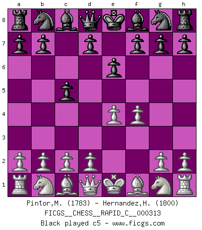 Last move : 0-1 2025 November 22 18:50:18 [Event "FICGS__CHESS__RAPID_C__000313"] [Site "FICGS"] [Date "2025.10.27"] [Round "1"] [White "Pintor,Manuel"] [Black "Hernandez,Humberto"] [Result "0-1"] [WhiteElo "1783"] [BlackElo "1800"] 1.e4 e6 2.f4 c5 3.Nf3 Nc6 4.Bc4 d5 5.exd5 exd5 6.Bb5 Bd6 7.d4 Nf6 8.O-O O-O 9.Bxc6 bxc6 10.c3 Re8 11.Ne5 Qb6 12.b3 Ba6 13.Rf2 Ne4 14.Rf3 cxd4 15.Kh1 dxc3 16.Be3 Qxe3 17.Rxe3 Nf2+ 18.Kg1 Nxd1 19.Re1 Bc5+ 20.Kh1 Nf2+ 0-1 Follow this game move after move (download)Many Chess players were surprised when after the game, Fischer quietly explained: 'I had already analyzed this possibility' in a position which I thought was not possible to foresee from the opening. (Mikhail Tal) Die größte Kunst beim Schach besteht darin dem Gegner nicht zu zeigen was er tun kann. (Garry Kasparov) Nada excita más a Grandes Maestros aburridos que una novedad teórica. (Dominic Lawson) Vous n'êtes pas toujours obligé de jouer le meilleur coup. Un coup doit être actif, entreprenant, correct et beau ! (David Bronstein) All war is based on deception. (Sun Tzu)
