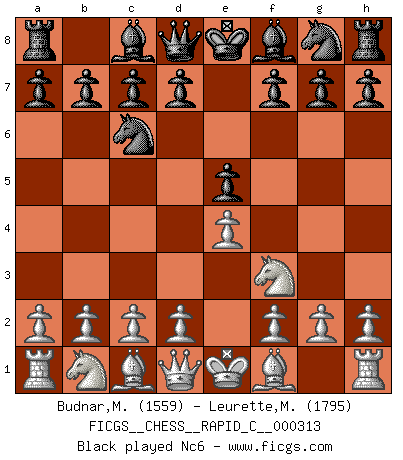 Last move : 0-1 2025 November 27 8:39:40 [Event "FICGS__CHESS__RAPID_C__000313"] [Site "FICGS"] [Date "2025.10.27"] [Round "1"] [White "Budnar,Milos"] [Black "Leurette,Marc-Antoine"] [Result "0-1"] [WhiteElo "1559"] [BlackElo "1795"] 1.e4 e5 2.Nf3 Nc6 3.Bb5 a6 4.Ba4 b5 5.Bb3 Nf6 6.d3 Be7 7.O-O d6 8.h3 Na5 9.Bd5 c6 10.Bb3 Nxb3 11.axb3 a5 12.Bg5 h6 13.Bh4 Be6 14.Nbd2 Nh5 15.Bxe7 Qxe7 16.c4 Nf4 17.Nh2 Nxd3 18.Qc2 Nf4 19.Ndf3 b4 20.c5 dxc5 21.Nxe5 Bxh3 22.Nxc6 Qd6 23.Rxa5 Rxa5 24.Nxa5 Bxg2 25.Qd1 Qg6 26.Qg4 Bxf1 27.Qxg6 Nxg6 28.Kxf1 O-O 29.f3 Rd8 30.Nc4 Nf4 31.Kf2 Rd3 32.Kg3 g5 33.Ng4 Kg7 34.Nge5 Rxb3 35.Kg4 f6 36.Nd7 Nd3 37.Kf5 Nxb2 38.Nxc5 Rxf3+ 39.Ke6 Nxc4 0-1 Follow this game move after move (download)The stomach is an essential part of the Chess master. (Bent Larsen) Kein Großmeister ist normal. Sie unterscheiden sich nur im Ausmaß Ihrer Verrücktheit. (Viktor Kortschnoi) La táctica fluye a partir de una posición superior. (Bobby Fischer) Les écrivains ont utilisé les échecs pour analyser les côtés extrêmes de la nature humaine. Dans ce cadre, les échecs offrent un champ d'expérimentation idéal. Mais on pourrait faire la même chose avec la peinture. Et là, en vous référant à Van Gogh, vous ne tirerez pas de conclusion définitive sur les peintres. (Gary Kasparov) Chess, like love, like music, has the power to make people happy. (Siegbert Tarrasch)