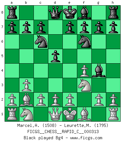 Last move : 0-1 2025 November 25 7:49:21 [Event "FICGS__CHESS__RAPID_C__000313"] [Site "FICGS"] [Date "2025.10.27"] [Round "1"] [White "Marcel,Alexis"] [Black "Leurette,Marc-Antoine"] [Result "0-1"] [WhiteElo "1508"] [BlackElo "1795"] 1.f4 d5 2.Nf3 Nc6 3.b3 Nf6 4.Bb2 Bg4 5.e3 Qd6 6.Be2 e6 7.O-O Be7 8.Nc3 O-O-O 9.a3 h5 10.h3 Bf5 11.Bd3 Ne4 12.Nb5 Qd7 13.Ne5 Nxe5 14.Bxe5 a6 15.Nxc7 f6 16.Nxe6 Qxe6 17.Bxe4 Bxe4 18.Bc3 Bc5 19.b4 Bb6 20.Re1 Bf5 21.Rc1 g5 22.fxg5 fxg5 23.Bxh8 Rxh8 24.Qe2 g4 25.hxg4 hxg4 26.c4 Qh6 27.Kf2 Qh4+ 28.Kf1 Qh1+ 29.Kf2 g3+ 30.Kf3 Be4+ 31.Kf4 Qh4+ 32.Ke5 Bc7+ 33.Kd4 Qf6+ 34.Kc5 b6+ 0-1 Follow this game move after move (download)Do you realize Fischer almost never has any bad pieces? He exchanges them, and the bad pieces remain with his opponents. (Yuri Balashov) Es war undenkbar für die Behörden, dass ein sowjetischer Großmeister auf diese Art und Weise [Fischer-Taimanov 6:0] verliert, ohne dass es eine politischer Erklärung dafür gäbe. (Mark Taimanov) Realmente no sabemos como el juego fue inventado, aunque hay sospechas. Tan pronto como descubramos a los culpables, se los haremos saber. (Bruce Pandolfini) Lorsque vous vous retrouvez devant une position atroce, ne tendez pas un ultime piège dérisoire avec l'intention d'abandonner si l'adversaire le déjoue ! Faites-vous plutôt un devoir de résister comme si votre vie en dépendait. Jouez le coup qui vous déplairait au centuple si vous étiez dans la peau de votre tortionnaire ! Have no fear of perfection - you'll never reach it. (Salvador Dali)