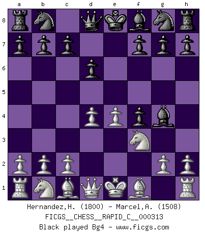 Last move : 1-0 2025 November 17 23:13:19 [Event "FICGS__CHESS__RAPID_C__000313"] [Site "FICGS"] [Date "2025.10.27"] [Round "1"] [White "Hernandez,Humberto"] [Black "Marcel,Alexis"] [Result "1-0"] [WhiteElo "1800"] [BlackElo "1508"] 1.e4 e5 2.f4 exf4 3.Nf3 d6 4.d4 Bg4 5.Bxf4 Nf6 6.h3 Bxf3 7.Qxf3 Nc6 8.c3 Be7 9.Bd3 O-O 10.Nd2 a6 11.O-O-O Qd7 12.g4 h6 13.Bc2 Nd8 14.e5 dxe5 15.dxe5 Ne8 16.Qe4 f5 17.gxf5 Bc5 18.f6 Qf7 19.Qh7+ 1-0 Follow this game move after move (download)In order to improve your game, you must study the endgame before everything else, for whereas the endings can be studied and mastered by themselves, the middle game and the opening must be studied in relation to the endgame. (Jose Raul Capablanca) Ich möchte Schüler heranbilden, die das Vermögen haben, selbst zu denken und Kritik zu üben. (Emanuel Lasker) El Ajedrez es un terrible juego. Si no controlas el centro, tu oponente tiene una posición mas holgada. Si tienes control del centro, ¡entonces realmente tu tienes algo de que preocuparte!. (Siegbert Tarrasch) Le système Elo représente seulement une moyenne. Il est simplement un indicateur de votre stabilité. (Anatoli Karpov) I can't decide which is riskier; taking crazy risks, or taking advice on crazy risks from a crazy risk taker. (Gregory House in House M.D.)