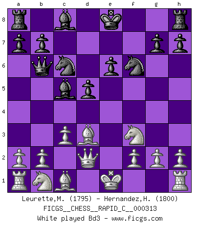 Last move : 0-1 2025 November 1 10:1:15 [Event "FICGS__CHESS__RAPID_C__000313"] [Site "FICGS"] [Date "2025.10.27"] [Round "1"] [White "Leurette,Marc-Antoine"] [Black "Hernandez,Humberto"] [Result "0-1"] [WhiteElo "1795"] [BlackElo "1800"] 1.e4 e6 2.d4 d5 3.e5 c5 4.c3 Nc6 5.Nf3 Qb6 6.dxc5 Bxc5 7.Qd2 f6 8.exf6 Nxf6 9.Bd3 e5 10.O-O e4 11.Re1 Ng4 12.Re2 O-O 13.b4 exf3 14.gxf3 Nce5 15.bxc5 Nxf3+ 0-1 Follow this game move after move (download)We don't really know how the game was invented, though there are suspicions. As soon as we discover the culprits, we'll let you know. (Bruce Pandolfini) Die jungen Leute sollen verstehen, dass sie noch etwas von mir lernen können und müssen. (Viktor Kortschnoi) En manos de Fischer's, una diminuta ventaja teórica es tan buena como tener una Reina de ventaja. (Isaac Kashdan) Dans le domaine de la peinture, de la gravure et de la sculpture, dès la première décennie de notre siècle, les artistes abandonnent la représentation de la partie d'échecs pour se concentrer sur les pièces, sur les échiquiers et sur toutes les variations auxquelles les unes et les autres peuvent donner lieu. On passe en quelque sorte d'un thème social à un thème musical (au sens de la musica médiévale, c'est-à-dire d'une notion qui inclue le rythme, l'harmonie, la construction et la déconstruction, etc.). Graphiquement et picturalement, l'échiquier apparaît comme une structure ouverte, dynamique, d'une richesse infinie, autorisant toutes les combinatoires et débouchant sur des mouvements et des rythmes de nature exponentielle. (Michel Pastoureau) Those parts of the system that you can hit with a hammer (not advised) are called hardware; those program instructions that you can only curse at are called software. (Anonymous)