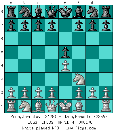 Last move : 1/2-1/2 2025 December 27 8:35:45 [Event "FICGS__CHESS__RAPID_M__000176"] [Site "FICGS"] [Date "2025.10.30"] [Round "1"] [White "Pech,Jaroslav"] [Black "Ozen,Bahadir"] [Result "1/2-1/2"] [WhiteElo "2125"] [BlackElo "2266"] 1.e4 e5 2.Nf3 Nc6 3.Bb5 a6 4.Ba4 Nf6 5.O-O Be7 6.Re1 b5 7.Bb3 O-O 8.c3 d5 9.exd5 Nxd5 10.Nxe5 Nxe5 11.Rxe5 c6 12.d4 Bd6 13.Re1 Qh4 14.g3 Qh3 15.Be3 Be6 16.Nd2 Bg4 17.Qc2 Bf5 18.Qd1 Bg4 19.Qc2 Bf5 20.Qd1 Bg4 1/2-1/2 Follow this game move after move (download)After black's reply to 1.e4 with 1..e5, leaves him always trying to get into the game. (Howard Staunton) Habe Mut, dich deines eigenen Verstandes zu bedienen. (Immanuel Kant) Coloca el contenido de las piezas del Ajedrez en un sombrero, agitalo vigorosamente, arrojalas en un tablero desde una altura de 30 centimetros y así obtendras el estilo de Steinitz. (H. E. Bird) On entre au jeu d'Echecs comme on entre en Religion. Pour le joueur d'Echecs, la partie d'Echecs c'est l'office, la messe, le défilé du 1er Mai, le dépôt de gerbe au Monument aux Morts. C'est un drame sacré. (Michel Roos) Memory is a complicated thing, a relative to truth, but not its twin. (Barbara Kingsolver, Animal Dreams)
