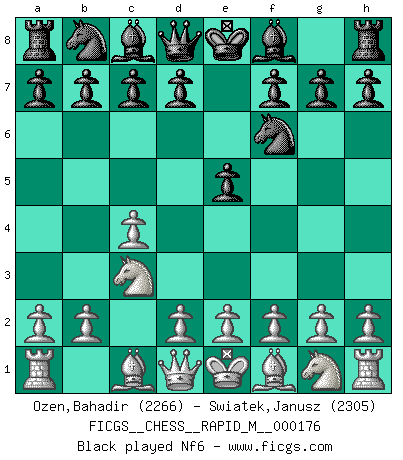 Last move : 1/2-1/2 2025 December 11 20:8:43 [Event "FICGS__CHESS__RAPID_M__000176"] [Site "FICGS"] [Date "2025.10.30"] [Round "1"] [White "Ozen,Bahadir"] [Black "Swiatek,Janusz"] [Result "1/2-1/2"] [WhiteElo "2266"] [BlackElo "2305"] 1.c4 e5 2.Nc3 Nf6 3.Nf3 Nc6 4.e4 Bb4 5.d3 d6 6.a3 Bc5 7.b4 Bb6 8.Be3 Bg4 9.Be2 Bxf3 10.Bxf3 O-O 11.O-O Nd4 12.Na4 Qd7 13.Nxb6 Nxf3+ 14.Qxf3 axb6 15.Bg5 Ne8 16.h3 c5 17.Be3 Nc7 18.Qd1 Ne6 19.a4 h6 20.Ra2 1/2-1/2 Follow this game move after move (download)We cannot resist the fascination of sacrifice, since a passion for sacrifices is part of a Chessplayer's nature. (Rudolf Spielman) Fischer ist das größte Genie, das je vom Schachhimmel heruntergestiegen ist. (Mikhail Nekhemyevich Tal) Alguna parte de un error es siempre correcto. (Savielly Tartakover) Toute estimation doit être constamment réévaluée. (Jacob Estrin) . 'gn is not allowed in chess unless n is an integer between 1 and 8 inclusive, where 1 and 8 are to interpreted as the standard numerals standing for integers in the ordered real-closed field R, with the *canonical* ordering. (As opposed to, say, an integer in the domain Z[2+i*sqrt(5)] or an integer in some exotic Grothendieck topos). (Normajean Yates)