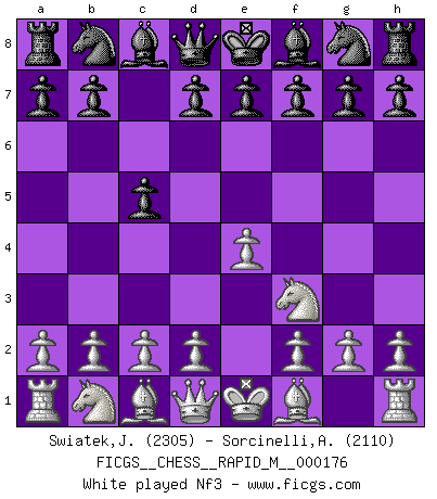 Last move : 1/2-1/2 2025 December 19 2:54:9 [Event "FICGS__CHESS__RAPID_M__000176"] [Site "FICGS"] [Date "2025.10.30"] [Round "1"] [White "Swiatek,Janusz"] [Black "Sorcinelli,Andrea"] [Result "1/2-1/2"] [WhiteElo "2305"] [BlackElo "2110"] 1.e4 c5 2.Nf3 d6 3.d4 cxd4 4.Nxd4 Nf6 5.Nc3 a6 6.Bg5 Nbd7 7.Qe2 Qc7 8.O-O-O h6 9.Bh4 g6 10.f4 e5 11.g4 Bg7 12.fxe5 Nxe5 13.h3 b5 14.Kb1 Bb7 15.g5 hxg5 16.Bxg5 b4 17.Nd5 Nxd5 18.exd5 Bxd5 19.Bg2 Bxg2 20.Qxg2 Rc8 21.h4 Qd7 22.h5 Rxh5 23.Rxh5 gxh5 24.Qh1 1/2-1/2 Follow this game move after move (download)Fischer Chess play was always razor-sharp, rational and brilliant. One of the best ever. (Dave Regis) Es gibt keine einzige Frau, der ich nicht einen Springer vorgeben könnte und trotzdem gewänne. (Robert James Fischer) Con el tiempo, empecé a progresar en partidas decisivas. Tal vez porque me di cuenta de una simple verdad: no solo estaba yo nervioso sino también mi oponente. (Mikhail Tal) La vie est comme un jeu d'échecs : nous esquissons un plan, mais celui-ci est tributaire de ce que daignent faire l'adversaire aux échecs et le destin dans la vie. (Arthur Schopenhauer) Locking firmely the window serves nothing, only small thiefs pass through there, the big thiefs enter through the front door. (Luc-Olivier Leclerc)
