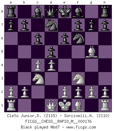 Last move : 1/2-1/2 2025 November 18 13:51:37 [Event "FICGS__CHESS__RAPID_M__000176"] [Site "FICGS"] [Date "2025.10.30"] [Round "1"] [White "Cleto Junior,Dirceu"] [Black "Sorcinelli,Andrea"] [Result "1/2-1/2"] [WhiteElo "2115"] [BlackElo "2110"] 1.d4 d5 2.c4 e6 3.Nf3 Nf6 4.Nc3 c6 5.Bg5 Nbd7 6.cxd5 exd5 7.e3 Be7 8.Bd3 Nh5 9.Bxe7 Qxe7 10.O-O O-O 11.Re1 Nhf6 12.Qb3 Ne4 13.a4 a5 14.Bxe4 dxe4 15.Nd2 Nf6 16.Qa3 Re8 17.Qxe7 Rxe7 18.Reb1 Be6 19.b4 axb4 20.Rxb4 Nd5 21.Nxd5 Bxd5 22.Nb1 Be6 23.h4 f5 24.Nc3 Ra5 25.Rab1 Bc8 26.Ne2 g6 27.Nc1 Be6 28.Kh2 Ra7 29.Ne2 h6 30.Rc1 Ra5 31.h5 g5 32.Rc5 Rxc5 33.dxc5 Kf7 34.g4 Kf6 35.Ng3 Ke5 36.gxf5 Bxf5 37.Rd4 Re8 38.Nxf5 Kxf5 1/2-1/2 Follow this game move after move (download)Mistrust is the most necessary characteristic of the Chess player. (Siegbert Tarrasch) Schach ist gnadenlos. Du mußt bereit sein zu töten. (Nigel Short) Después de la respuesta de las negras a 1.e4 con 1..e5, se quedan siempre tratando de entrar dentro del juego. (Howard Staunton) Le jeu d'échecs est comme rejeté hors du temps. (Antoine de Saint-Exupéry) The right perception of any matter and a misunderstanding of the same matter do not wholly exclude each other. (Kafka's the trial)