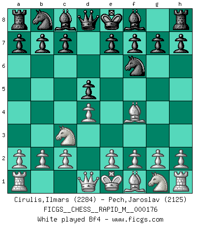 Last move : 1/2-1/2 2026 January 6 4:32:47 [Event "FICGS__CHESS__RAPID_M__000176"] [Site "FICGS"] [Date "2025.10.30"] [Round "1"] [White "Cirulis,Ilmars"] [Black "Pech,Jaroslav"] [Result "1/2-1/2"] [WhiteElo "2284"] [BlackElo "2125"] 1.d4 d5 2.Nc3 Nf6 3.Bf4 Bf5 4.f3 e6 5.g4 Bg6 6.h4 h5 7.g5 Nfd7 8.e4 dxe4 9.a3 Bd6 10.Bxd6 cxd6 11.fxe4 Qb6 12.Nge2 O-O 13.b3 Nc6 14.Qd2 Qa5 15.Bh3 Rfe8 16.O-O Nf8 17.b4 Qb6 18.Rf2 Rac8 19.Rd1 a6 20.Qd3 d5 21.Nf4 Rcd8 22.Nxg6 dxe4 23.Qxe4 Nxg6 24.Ne2 Nce7 25.Rdf1 Nf5 26.Bxf5 exf5 27.Qxf5 Qc7 28.Qf3 Rd7 29.c3 Re6 30.Ng3 Nxh4 31.Qf4 Qxf4 32.Rxf4 Ng6 33.R4f3 1/2-1/2 Follow this game move after move (download)Many have become Chess Masters, no one has become the Master of Chess. (Siegbert Tarrasch) Ohne Leiden bildet sich kein Charakter. (Ernst Freiherr von Feuchtersleben) Realmente no sabemos como el juego fue inventado, aunque hay sospechas. Tan pronto como descubramos a los culpables, se los haremos saber. (Bruce Pandolfini) Aux échecs, les retours au sommet sont rares : les dommages psychologiques consécutifs à une défaite sont trop sévères. (Daily Telegraph) Memory is a way of holding onto the things you love, the things you are, the things you never want to lose. (from the television show: The Wonder Years)