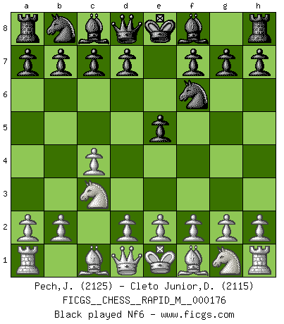 Last move : 1/2-1/2 2025 December 26 2:28:17 [Event "FICGS__CHESS__RAPID_M__000176"] [Site "FICGS"] [Date "2025.10.30"] [Round "1"] [White "Pech,Jaroslav"] [Black "Cleto Junior,Dirceu"] [Result "1/2-1/2"] [WhiteElo "2125"] [BlackElo "2115"] 1.c4 e5 2.Nc3 Nf6 3.Nf3 Nc6 4.g3 d5 5.cxd5 Nxd5 6.Bg2 Nb6 7.O-O Be7 8.d3 O-O 9.a3 Be6 10.Be3 f5 11.Rc1 Kh8 12.b4 a6 13.Na4 Nxa4 14.Qxa4 Bd5 15.Bc5 Qe8 16.Qc2 Rd8 17.Qb2 e4 18.dxe4 fxe4 19.Nd2 Bxc5 20.Rxc5 Qe7 21.e3 a5 1/2-1/2 Follow this game move after move (download)An attack on the wing should be met by play in the center. (Nimzovitch) Es ist nicht das erste mal, dass sich die FIDE dem Arabischen Geld gebeugt hat (über die FIDE WM 2004 in Lybien). (Larry Evans) El Ajedrez es un terrible juego. Si no controlas el centro, tu oponente tiene una posición mas holgada. Si tienes control del centro, ¡entonces realmente tu tienes algo de que preocuparte!. (Siegbert Tarrasch) RxDa4 pat (...) The age of a woman doesn't mean a thing. The best tunes are played on the oldest fiddles. (Ralph Waldo Emerson)