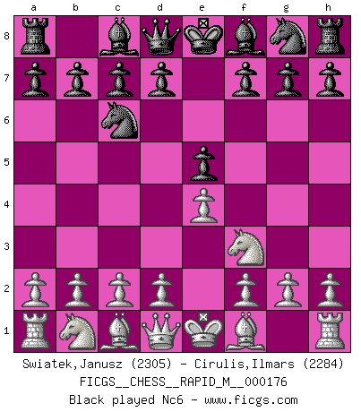 Last move : 1/2-1/2 2025 December 20 15:55:9 [Event "FICGS__CHESS__RAPID_M__000176"] [Site "FICGS"] [Date "2025.10.30"] [Round "1"] [White "Swiatek,Janusz"] [Black "Cirulis,Ilmars"] [Result "1/2-1/2"] [WhiteElo "2305"] [BlackElo "2284"] 1.e4 e5 2.Nf3 Nc6 3.Bb5 a6 4.Ba4 b5 5.Bb3 Nf6 6.d4 d6 7.c3 Be7 8.h3 h6 9.O-O O-O 10.Nbd2 Re8 11.Re1 Bd7 12.Bc2 a5 13.Nf1 Bf8 14.Ng3 a4 15.Be3 a3 16.b3 exd4 17.cxd4 Nb4 18.Bb1 c5 19.Bd2 Rc8 20.Bxb4 cxb4 21.Bd3 Nh7 22.Rc1 Rxc1 23.Qxc1 g6 24.h4 h5 25.Qf4 Qf6 26.Qxf6 Nxf6 27.Rc1 Be7 28.Ne1 Bd8 29.Nc2 Ng4 30.Nxb4 Bxh4 31.Rc7 Rd8 32.Kf1 Kf8 33.Nd5 Be6 34.Nb4 Bd7 35.Nc2 f5 36.Nxa3 Nxf2 37.Kxf2 1/2-1/2 Follow this game move after move (download)I am the best player in the world and I am here to prove it. (Bobby Fischer) Ich könnte leicht behaupten: Ja,ja, Leonid Breschnew wollte nicht, daß ich Weltmeister werde. In der Tat war die Sache komplizierter. (Viktor Kortschnoi) El Ajedrez no es como la vida... ¡tiene reglas!. (Mark Pasternak) La vie et les Echecs sont tous les deux une lutte constante. (Lasker) When I took office, only high energy physicists had ever heard of what is called the World Wide Web... Now even my cat has its own page. (Bill Clinton, 1996)