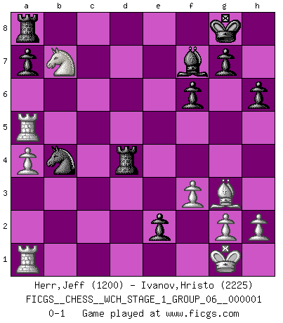 Last move : 0-1 2006 October 16 12:45:5 [Event "FICGS__CHESS__WCH_STAGE_1_GROUP_06__000001"] [Site "FICGS"] [Date "2006.07.01"] [Round "1"] [White "Herr,Jeff"] [Black "Ivanov,Hristo"] [Result "0-1"] [WhiteElo "1200"] [BlackElo "2225"] 1.d4 Nf6 2.c4 e6 3.Nc3 Bb4 4.Qc2 O-O 5.a3 Bxc3+ 6.bxc3 d5 7.Bg5 h6 8.Bh4 c5 9.e3 Nbd7 10.Nf3 Qa5 11.Be2 cxd4 12.exd4 Ne4 13.cxd5 exd5 14.O-O Qxc3 15.Rfc1 Qxc2 16.Rxc2 f6 17.Bd3 Nb6 18.Bxe4 dxe4 19.Nd2 Bf5 20.Rc5 Bg6 21.Re1 Rfd8 22.Nb3 Bf7 23.Na5 Rxd4 24.Nxb7 Nc4 25.a4 Nb2 26.Ra1 Nd3 27.Ra5 e3 28.Bg3 e2 29.f3 Nb4 0-1 Nimzo-Indian : Classical variation Kingside Castling by player Black (move 4) Kingside Castling by player White (move 14) Player Black won this chess game. Follow this game move after move (download)Dazzling combinations are for the many, shifting wood is for the few. (Georg Kieninger) Viele Opfer benötigen überhaupt keine konkrete Berechnung. Es genügt sich die entstehende Position kurz vorzustellen, um uns davon zu überzeugen, dass das Opfer korrekt ist. (Mikhail Nekhemyevich Tal) Las Aperturas te enseñan aperturas. ¡Los Finales te enseñan Ajedrez!. (Stephan Gerzadowicz) C'est une question de caractère, Beaucoup de gens perdent leur motivation très vite. D'autres, ils sont rares, peuvent la conserver très longtemps. J'aime les échecs, encore aujourd'hui je suis heureux d'analyser des parties. J'aime toujours gagner, je déteste encore perdre. Bien jouer est important pour mon intégrité intellectuelle et morale. Et puis les échecs vivent en ce moment une période historique grâce à Internet. Ils se développent dans les systèmes éducatifs à travers le monde. Ils sortent de leur ghetto, et c'est mon rôle de mener à bien cette révolution. (Gary Kasparov) The greatest con, that he ever pulled... was making you believe... that he is you. (Revolver, movie)