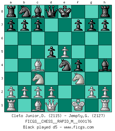Last move : 0-1 2025 December 5 19:8:51 [Event "FICGS__CHESS__RAPID_M__000176"] [Site "FICGS"] [Date "2025.10.30"] [Round "1"] [White "Cleto Junior,Dirceu"] [Black "Jempty,George"] [Result "0-1"] [WhiteElo "2115"] [BlackElo "2127"] 1.e4 e5 2.f4 exf4 3.Nf3 Be7 4.Bc4 Nf6 5.e5 Ne4 6.Nc3 Bh4+ 7.Kf1 d5 8.Bxd5 Nxc3 9.dxc3 c6 10.Nxh4 cxd5 11.Nf3 Nc6 12.Bxf4 O-O 13.Kf2 Bf5 14.Qd2 Be4 15.b3 f6 16.e6 Re8 17.Rhe1 Rxe6 18.Re2 Qe7 19.a4 Re8 20.Rae1 h6 21.Kg1 Kh7 22.Bg3 f5 23.h4 Rg6 24.Bf4 Rg4 25.g3 Nd8 26.Rh2 Ne6 27.Ne5 Nxf4 28.Nxg4 Nh5 29.Nf2 Nxg3 30.Nd3 Nh5 31.Nf4 Nxf4 32.Qxf4 Qc5+ 33.Qe3 Qc7 0-1 Comment by player 2 : George Jempty : In the meantime just last month I've switched away from the Cunningham after a half-century!! Want to see what I have up my sleeve? Follow this game move after move (download)If one piece is badly posted, the whole game is bad. (Tarrasch) Vielleicht wirkt die Aura früherer Spieler glanzvoller als die der heutigen Spieler, aber das liegt daran, dass man kein Programm wie Fritz hatte, das einem all die Löcher in ihren Partien zeigt. (Vladimir Kramnik) Puntos débiles o agujeros en la posición de tu oponente deben de ser ocupados por piezas, no Peones. (Siegbert Tarrasch) Les échecs sont plus proches de l'art de l'assassinat que de l'art de la guerre. (Arturo Perez-Reverte) Knowledge will give you power, but character respect. (Bruce Lee)