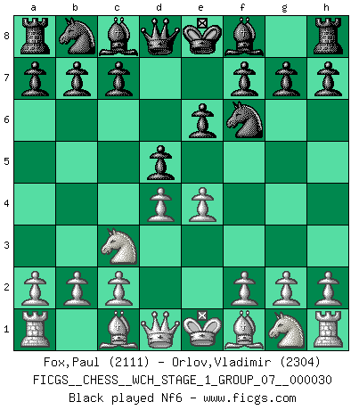 Last move : 1-0 2025 December 25 13:11:53 [Event "FICGS__CHESS__WCH_STAGE_1_GROUP_07__000030"] [Site "FICGS"] [Date "2025.10.30"] [Round "1"] [White "Fox,Paul"] [Black "Orlov,Vladimir"] [Result "1-0"] [WhiteElo "2111"] [BlackElo "2304"] 1.e4 e6 2.d4 d5 3.Nc3 Nf6 4.Bg5 dxe4 5.Nxe4 Be7 6.Bxf6 gxf6 7.Nf3 f5 8.Nc3 a6 9.Qe2 b5 10.O-O-O b4 11.Na4 Qd5 12.c4 Qa5 13.Qe5 Qxe5 14.Nxe5 Nd7 15.Nc6 a5 16.Nxe7 Kxe7 17.d5 Nf6 18.Re1 Rd8 19.g3 Ne4 20.f3 Nd6 21.dxe6 Bxe6 22.b3 Kf6 23.Rd1 h5 24.Nc5 h4 25.Be2 Rh8 26.g4 Rae8 27.Rhe1 Bc8 28.Rd5 Rhg8 29.h3 Rg5 30.f4 R5g8 31.g5+ Kg7 32.Kd2 f6 33.Rg1 fxg5 34.Bh5 Kh6 35.Bxe8 1-0 Follow this game move after move (download)The tactician must know what to do whenever something needs doing; the strategist must know what to do when nothing needs doing. (Savielly Tartakover) Was ist der Unterschied zwischen einem Strassenarbeiter und einem Schachspieler? --Der Schachspieler bewegt sich ab und zu. (Anonymous) Todo se encuentra en un estado de flujo y esto incluye al mundo del Ajedrez. (Mikhail Botvinnik) Ce n'est pas pour s'amuser qu'il joue aux échecs : il célèbre un culte. (Vladimir Nabokov) Shallow men believe in luck. Strong men belive in cause and effect. (Ralph Waldo Emerson)