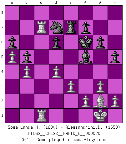 Last move : 0-1 2008 February 23 2:20:24 [Event "FICGS__CHESS__RAPID_B__000070"] [Site "FICGS"] [Date "2007.10.07"] [Round "1"] [White "Sosa Landa,Hugo Rafael"] [Black "Alessandrini,Daniele"] [Result "0-1"] [WhiteElo "1600"] [BlackElo "1650"] 1.g3 Nf6 2.Bg2 g6 3.b4 Bg7 4.Bb2 O-O 5.Nf3 d6 6.d3 e5 7.Nbd2 Nbd7 8.c4 b6 9.Nxe5 Rb8 10.Nc6 Qe8 11.Nxb8 Nxb8 12.O-O Be6 13.Qc2 c6 14.Ne4 Qd8 15.Nxf6+ Bxf6 16.Bxf6 Qxf6 17.a4 Re8 18.a5 b5 19.cxb5 cxb5 20.Qc7 Qe7 21.Qxe7 Rxe7 22.Rfc1 a6 23.Rc3 Bf5 24.e3 Kg7 25.Rac1 Kf6 26.d4 h5 27.Rc7 Nd7 0-1 This chess game has been lost on time (started : 2007.10.07 16:34:7) Benko's Opening Kingside Castling by player Black (move 4) Kingside Castling by player White (move 12) Player Black won this chess game. Follow this game move after move (download)The beauty of a move lies not in its' appearance but in the thought behind it. (Siegbert Tarrasch) Es ist peinlich, dass ich nie Weltmeister wurde. Es wäre leicht, Leonid Breschnjew als Ursache vorzuschieben, dessen Apparat den Vorzeigekommunisten Anatoli Karpow in allem unterstützte. Aber Garri Kasparow zum Beispiel, der ebenfalls von den Sowjets unerwünscht war, hat trotz der Widerstände den WM-Titel erobert. (Viktor Kortschnoi) Fischer es el jugador mas fuerte del mundo. De hecho, el jugador mas fuerte que jamas haya existido. (Larry Evans) Seul un grand joueur sait à quel point il joue faiblement. (Xavier Tartacover) Being number two sucks. (Andre Agassi)