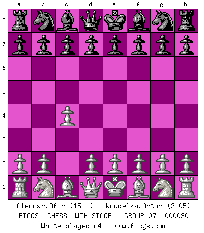 Last move : 0-1 2025 December 24 9:35:4 [Event "FICGS__CHESS__WCH_STAGE_1_GROUP_07__000030"] [Site "FICGS"] [Date "2025.10.30"] [Round "2"] [White "Alencar,Ofir"] [Black "Koudelka,Artur"] [Result "0-1"] [WhiteElo "1511"] [BlackElo "2105"] 1.c4 c5 2.Nc3 Nc6 3.a3 Nf6 4.g3 d5 5.Nxd5 Nxd5 6.cxd5 Qxd5 7.f3 g6 8.e4 Qd6 9.Bb5 Bg7 10.Bxc6+ bxc6 11.Rb1 Ba6 12.Ne2 Qd3 13.Ra1 Qxf3 14.Rf1 Qxe4 15.Rf3 Qxf3 0-1 Follow this game move after move (download)Who is your opponent tonight, tonight I am playing against the Black pieces. (Akiba Rubinstein) Zum Sieg gelangt man nicht, wenn man gut, sondern nur wenn man besser spielt (Savielly Grigorievitsch Tartakower) La caracteristica mas importante en la posición del Ajedrez es la actividad de las piezas. Esto es absolutamente fundamental en todas las fases del juego: Apertura, Juego Medio y especialmente Finales. La limitación primordial en la actividad de una pieza, es la estructuración de los Peones. (Michael Stean) La vérité est comme le meilleur coup aux échecs : elle existe, mais il faut la chercher. (Arturo Perez-Reverte) Wawaweewa ! (Borat: Cultural learnings of America for make benefit glorious nation of Kazakhstan)