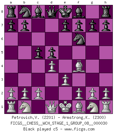 Last move : 1/2-1/2 2026 January 12 7:24:30 [Event "FICGS__CHESS__WCH_STAGE_1_GROUP_08__000030"] [Site "FICGS"] [Date "2025.10.30"] [Round "2"] [White "Petrovich,Valery"] [Black "Armstrong,Keith"] [Result "1/2-1/2"] [WhiteElo "2201"] [BlackElo "2300"] 1.d4 Nf6 2.Bf4 d5 3.e3 c5 4.Nf3 Nc6 5.Nbd2 Qb6 6.dxc5 Qxb2 7.Rb1 Qc3 8.Bb5 e6 9.O-O Be7 10.e4 O-O 11.e5 Nd7 12.Nb3 Qb4 13.Nfd4 Nxd4 14.Nxd4 Qxc5 15.Re1 a6 16.Bd3 g6 17.Nf3 b5 18.Qd2 b4 19.h4 a5 20.Be3 Qc3 21.Qxc3 bxc3 22.Bb5 Nb8 23.Bh6 Rd8 24.Re3 Ba6 25.Bxa6 Nxa6 26.Rb7 Bf8 27.Bxf8 Rxf8 28.Rxc3 Rac8 29.Rxc8 Rxc8 30.Ng5 Rc7 1/2-1/2 Follow this game move after move (download)Chess is war over the board. The object is to crush the opponents mind. (Bobby Fischer) Stelle das Brett so, daß die Sonne in die Augen deines Gegners scheint. (Ruy López) El Ajedrez hace al hombre ser mas sabio y ver mas claro. (Vladimir Putin) Je crois qu'il existe des manières très spécifiques de jouer efficacement contre une machine. Evidemment, nous n'avons aucune chance en technique pure, parce que l'ordinateur calcule de manière parfaite. Mais lorsque nous faisons appel à notre cerveau, en utilisant l'intuition et la compréhension, alors nous restons beaucoup plus forts. (Anatoli Karpov) He who laughs last probably does not get the joke. (Unknown)