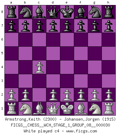 Last move : 1-0 2025 November 30 8:59:30 [Event "FICGS__CHESS__WCH_STAGE_1_GROUP_08__000030"] [Site "FICGS"] [Date "2025.10.30"] [Round "1"] [White "Armstrong,Keith"] [Black "Johansen,Jorgen"] [Result "1-0"] [WhiteElo "2300"] [BlackElo "1915"] 1.c4 1-0 This chess game has been lost on time (started : 2025.10.30 11:46:4) Follow this game move after move (download)I had a toothache during the first game. In the second game I had a headache. In the third game it was an attack of rheumatism. In the fourth game, I wasn't feeling well. And in the fifth game? Well, must one have to win every game ? (Siegbert Tarrasch) Wenn Du absolut nicht mehr weißt, was Du tun sollst, dann ist es Zeit für Panik. (John van der Wiel) ¿Porque tengo que perder ante este idiota?. (Aron Nimzovich) Des combinaisons [dans le jeu d'échecs] pareilles à des mélodies. Je crois entendre pour ainsi dire la musique des coups... (Vladimir Nabokov) Man with more than one clock never knows what time it is. (Chinese thought)
