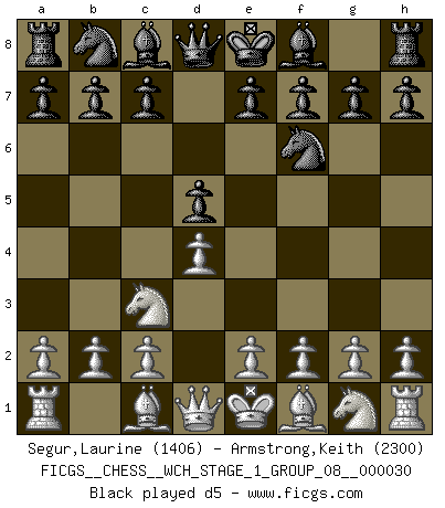 Last move : 0-1 2026 January 11 23:36:3 [Event "FICGS__CHESS__WCH_STAGE_1_GROUP_08__000030"] [Site "FICGS"] [Date "2025.10.30"] [Round "1"] [White "Segur,Laurine"] [Black "Armstrong,Keith"] [Result "0-1"] [WhiteElo "1406"] [BlackElo "2300"] 1.d4 Nf6 2.Nc3 d5 3.Nf3 c5 4.g3 cxd4 5.Nxd4 e5 6.Nf3 Nc6 7.Bg2 h6 8.O-O Be6 9.e4 Nxe4 10.Nxe4 dxe4 11.Nd2 f5 12.Qh5+ Ke7 13.b3 Qe8 14.Qd1 Rd8 15.Qe2 Nd4 16.Qd1 Qc6 17.Ba3+ Kf7 18.Bxf8 Rhxf8 19.Re1 Qxc2 20.Qc1 Qxd2 21.Qc7+ Kf6 22.Bf1 Nf3+ 23.Kg2 Nxe1+ 24.Kg1 e3 25.f3 Nxf3+ 26.Kh1 Qxh2+ 0-1 Follow this game move after move (download)Chess is a part of culture and if a culture is declining then Chess too will decline. (Mikhail Botvinnik) Wenn Du nicht kämpfst, um anderen etwas zu beweisen, sondern nur für Dich selbst, dann bist du fast unbesiegbar. (Garry Kasparov) Si un gobernante no entiende al Ajedrez, ¿como puede governar él un reinado?. (El Rey Khusros II) Tous ces prétendus hommes politiques sont les pions, les Cavaliers, les Tours ou les Fous d'une partie d'échecs qui se jouera tant qu'un hasard ne renversera pas l'échiquier. (Honoré de Balzac) I just play for fun. (Anna Kournikova)