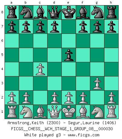 Last move : 1-0 2025 December 7 0:45:22 [Event "FICGS__CHESS__WCH_STAGE_1_GROUP_08__000030"] [Site "FICGS"] [Date "2025.10.30"] [Round "2"] [White "Armstrong,Keith"] [Black "Segur,Laurine"] [Result "1-0"] [WhiteElo "2300"] [BlackElo "1406"] 1.c4 e5 2.g3 Nf6 3.Bg2 c6 4.Nf3 e4 5.Nd4 c5 6.Nc2 Nc6 7.d3 d5 8.cxd5 Qxd5 9.Nc3 Qe6 10.dxe4 b6 11.Nb5 Qe5 12.Bf4 Qe6 13.Nc7+ 1-0 Follow this game move after move (download)If Chess is a science, it's a most inexact one. If Chess is an art, it is too exacting to be seen as one. If Chess is a sport, it's too esoteric. If Chess is a game, it's too demanding to be just a game. If Chess is a mistress, she's a demanding one. If Chess is a passion, it's a rewarding one. If Chess is life, it's a sad one. (Unknown) Mutter, ich bin eben Ex-Weltmeister geworden. --beim nach Hause Kommen nach dem Verlust des WM-Titels an Mihail Botvinnik -- (Mikhail Nekhemyevich Tal) Hay dos clases de hombres: aquellos que se conforman en dejarse llevar por las circunstancias y que juegan barajas y aquellos decididos a controlar las circunstancias y que juegan al Ajedrez. (Mortimer Collins) On est toujours la mazette de quelqu'un d'autre. (Anonyme) Have no fear of perfection - you'll never reach it. (Salvador Dali)