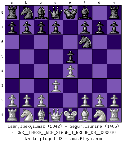 Last move : Nd4 2025 December 28 13:21:37 Ipekyilmaz Eser ... is in vacation until 2026 February 17 10:28:6 White clock - 13 days 00:45:31 Black clock - 9 days 00:32:27 [Event "FICGS__CHESS__WCH_STAGE_1_GROUP_08__000030"] [Site "FICGS"] [Date "2025.10.30"] [Round "2"] [White "Eser,Ipekyilmaz"] [Black "Segur,Laurine"] [Result "*"] [WhiteElo "2042"] [BlackElo "1406"] 1.e3 e5 2.e4 Nf6 3.d3 d5 4.Bg5 Be7 5.Nd2 h6 6.Bxf6 Bxf6 7.g3 Nc6 8.Bg2 dxe4 9.dxe4 O-O 10.h3 b6 11.Ne2 Bb7 12.Nc3 Nd4 13.* Follow this game move after move (download)In order to improve your game, you must study the endgame before everything else, for whereas the endings can be studied and mastered by themselves, the middle game and the opening must be studied in relation to the endgame. (Jose Raul Capablanca) Lisa Lane, amerikanische Schachmeisterin, hatte Fischer einmal als stärksten lebenden Spieler bezeichnet. Antwort: Das ist richtig, aber Lisa Lane ist eigentlich nicht in der Lage, das zu beurteilen. (Robert James Fischer) Un entendimiento a fondo de las continuaciones típicas del mate, hace de las combinaciones de sacrificio mas complicadas conducirlas a ellas no solo sin dificultad, sino casi de una manera natural. (Siegbert Tarrasch) Psychologiquement, tu dois avoir confiance en toi même, mais cette confiance doit être basée sur des faits. (Robert Fischer) I don't know, I don't care, and it doesn't make any difference. (Albert Einstein)