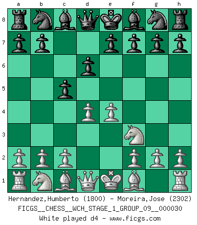 Last move : 1/2-1/2 2025 November 26 8:55:29 [Event "FICGS__CHESS__WCH_STAGE_1_GROUP_09__000030"] [Site "FICGS"] [Date "2025.10.30"] [Round "1"] [White "Hernandez,Humberto"] [Black "Moreira,Jose"] [Result "1/2-1/2"] [WhiteElo "1800"] [BlackElo "2302"] 1.e4 c5 2.Nf3 d6 3.d4 cxd4 4.Qxd4 Nc6 5.Bb5 a6 6.Bxc6+ bxc6 7.O-O e5 8.Qd3 Ne7 9.c4 Ng6 10.Rd1 Be7 11.Nc3 O-O 12.c5 dxc5 13.Qxd8 Rxd8 14.Rxd8+ Bxd8 15.Be3 Rb8 16.Na4 c4 17.Nd2 Rb4 18.b3 cxb3 19.axb3 f6 20.Rc1 Ne7 21.Nc5 Ng6 22.Na4 Ne7 23.Nc5 Ng6 24.Na4 1/2-1/2 Follow this game move after move (download)Fischer wanted to give the Russians a taste of their own medicine. (Larry Evans) Verschiedene, sehr schätzbare und im Laufe des Lebens nützliche Eigenschaften des Geistes können durch das Schachspiel erworben und gekräftigt werden, so dass sie zu Gewohnheiten werden, die uns nie im Stich lassen. (Benjamin Franklin) El Ajedrez es una hermosa aventura. (Bent Larsen) Tous ces prétendus hommes politiques sont les pions, les Cavaliers, les Tours ou les Fous d'une partie d'échecs qui se jouera tant qu'un hasard ne renversera pas l'échiquier. (Honoré de Balzac) Fortune favours the audacious. (Desiderius Erasmus)