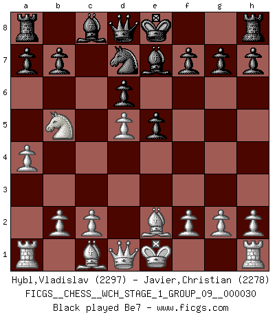 Last move : Qb3 2026 February 1 15:12:19 White clock - 5 days 10:07:07 Black clock - 21 days 01:43:26 [Event "FICGS__CHESS__WCH_STAGE_1_GROUP_09__000030"] [Site "FICGS"] [Date "2025.10.30"] [Round "1"] [White "Hybl,Vladislav"] [Black "Javier,Christian"] [Result "*"] [WhiteElo "2297"] [BlackElo "2278"] 1.e4 c5 2.Nf3 Nc6 3.d4 cxd4 4.Nxd4 Nf6 5.Nc3 e5 6.Ndb5 d6 7.Nd5 Nxd5 8.exd5 Nb8 9.a4 Nd7 10.Be2 Be7 11.O-O O-O 12.b4 f5 13.a5 a6 14.Na3 b6 15.axb6 Nxb6 16.c4 f4 17.Bd3 f3 18.g3 Qd7 19.Re1 Qh3 20.Bf1 Qh5 21.c5 Bh3 22.Bd3 dxc5 23.d6 Bxd6 24.Nc4 Bc7 25.Nxb6 Bxb6 26.Be3 Kh8 27.Rxa6 Rad8 28.Qb3 * Follow this game move after move (download)What is the object of playing a gambit opening?... To acquire a reputation of being a dashing player at the cost of losing a game. (Siegbert Tarrasch) Im Spitzenschach von heute geht es nur um Vorbereitung, um tiefgründige, sorgfältige Eröffnungsvorbereitung. (Nigel Short) El Ajedrez es en su esencia, un juego. En su forma, un arte. Y en su ejecución, una ciencia. (Baron Tassilo) Les pièces de l'échiquier étaient impitoyables. Elles le retenaient, elles l'absorbaient. Il y avait de l'horreur en cela, mais aussi une harmonie unique. Car, qu'y a-t-il dans le monde, à part les échecs ? (V. Nabokov) Perhaps chess is the wrong game for the times (The Chess Master and the Computer, by Garry Kasparov - 2010)