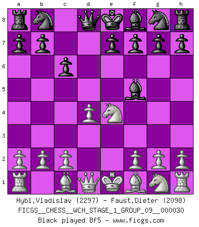 Last move : Bxh4 2026 February 2 23:36:53 White clock - 5 days 20:40:12 Black clock - 44 days 17:51:23 [Event "FICGS__CHESS__WCH_STAGE_1_GROUP_09__000030"] [Site "FICGS"] [Date "2025.10.30"] [Round "2"] [White "Hybl,Vladislav"] [Black "Faust,Dieter"] [Result "*"] [WhiteElo "2297"] [BlackElo "2098"] 1.e4 c6 2.d4 d5 3.Nc3 dxe4 4.Nxe4 Bf5 5.Ng3 Bg6 6.Nf3 Nd7 7.h4 h6 8.h5 Bh7 9.Bd3 Bxd3 10.Qxd3 e6 11.Bd2 Ngf6 12.O-O-O Be7 13.Ne4 O-O 14.Nxf6+ Nxf6 15.Kb1 c5 16.g4 Nxg4 17.Qe2 cxd4 18.Rhg1 d3 19.cxd3 f5 20.Qxe6+ Kh8 21.d4 Bf6 22.Rc1 Rc8 23.Bb4 Rxc1+ 24.Rxc1 Re8 25.Qxf5 Nxf2 26.a3 Ne4 27.Qg6 Qd7 28.Re1 Nd6 29.Ne5 Bxe5 30.dxe5 Qf5+ 31.Ka2 Qxg6 32.hxg6 Nf5 33.Re4 a5 34.Bxa5 Ne7 35.Rb4 Nxg6 36.Rxb7 h5 37.a4 h4 38.Be1 Kg8 39.a5 Nxe5 40.Bxh4 * Follow this game move after move (download)Many have become Chess Masters, no one has become the Master of Chess. (Siegbert Tarrasch) Pläne sind die Träume des Verständigen. (Ernst Freiherr von Feuchtersleben) Yo tuve un dolor de muelas en la primer partida. En el segundo juego, tuve un dolor de cabeza. En el tercero, tuve un ataque de reumatísmo. En la cuarta partida, no me sentía muy bien. ¿Y en el quinto juego? Bueno, ¿que acaso uno tiene que ganar todos los juegos?. (Siegbert Tarrasch) Des points faibles ou des trous dans la position de l'adversaire doivent être occupés par des pièces et non pas par des pions. (Siegbert Tarrasch) To err is human, to shift the blame on someone else is tactical. (Mladen Jankovic)