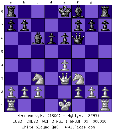 Last move : d5 2026 February 2 23:15:9 White clock - 26 days 14:02:12 Black clock - 4 days 10:56:00 [Event "FICGS__CHESS__WCH_STAGE_1_GROUP_09__000030"] [Site "FICGS"] [Date "2025.10.30"] [Round "2"] [White "Hernandez,Humberto"] [Black "Hybl,Vladislav"] [Result "*"] [WhiteElo "1800"] [BlackElo "2297"] 1.e4 c5 2.Nf3 d6 3.d4 cxd4 4.Qxd4 Nc6 5.Bb5 Bd7 6.Bxc6 Bxc6 7.Nc3 Nf6 8.Bg5 e6 9.Bxf6 Qxf6 10.Qe3 Be7 11.O-O-O O-O 12.Kb1 Rfc8 13.g4 b5 14.g5 Qg6 15.h4 h5 16.gxh6 Qxh6 17.Ng5 b4 18.Ne2 a5 19.Rhg1 a4 20.Nd4 Be8 21.Rdf1 Bf8 22.f4 a3 23.b3 Ra5 24.Qf3 Rc7 25.f5 exf5 26.exf5 Bd7 27.Ne4 Re5 28.Rd1 Bc6 29.Nxc6 Rxc6 30.Nf2 d5 31.* Follow this game move after move (download)Chess demands total concentration. (Bobby Fischer) Schach ist eine Sache der genauen Beurteilung, wann man zuschlagen und wann man sich ducken muss. (Robert James Fischer) El Ajedrez demanda una total concentración. (Bobby Fischer) Les échecs, c'est la lutte contre l'erreur. (Johannes Zukertort) Wisdom doesn't necessarily come with age. Sometimes age just shows up all by itself. (Tom Watson)