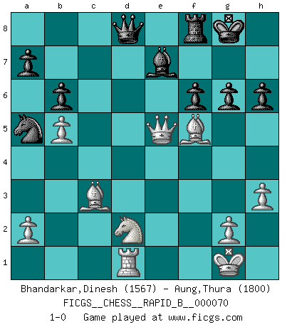 Last move : 1-0 2008 January 19 11:27:25 [Event "FICGS__CHESS__RAPID_B__000070"] [Site "FICGS"] [Date "2007.10.07"] [Round "1"] [White "Bhandarkar,Dinesh"] [Black "Aung,Thura"] [Result "1-0"] [WhiteElo "1567"] [BlackElo "1800"] 1.e4 c5 2.d4 cxd4 3.c3 dxc3 4.Nxc3 e6 5.Nf3 Nc6 6.Bc4 d6 7.O-O Nf6 8.Qe2 Be7 9.Rd1 e5 10.Be3 O-O 11.b4 Bg4 12.b5 Na5 13.Bd3 h6 14.h3 Be6 15.Rac1 b6 16.Nd2 Rc8 17.f4 exf4 18.Bxf4 d5 19.exd5 Rxc3 20.Rxc3 Nxd5 21.Qe4 g6 22.Be5 Nxc3 23.Bxc3 Bf5 24.Qe5 f6 25.Bxf5 1-0 This chess game has been lost on time (started : 2007.10.07 16:34:7) Sicilian : Smith-Morra gambit Kingside Castling by player White (move 7) Kingside Castling by player Black (move 10) Player White won this chess game. Follow this game move after move (download)A great player and a great example for many. His book My 60 Memorable Games had a big impact on me. It is a shame he didn't continue to enrich the world of chess with his unparalleled understanding after 1972. (Jan Timman, about Bobby Fischer's death) Ja, ich habe einmal eine Blitzpartie gespielt, es war in einem Zug, 1929. --im Interview 1989 (Mikhail Moiseyevich Botvinik) La estratégia requiere pensar, la táctica requiere observación. (Max Euwe) On entre au jeu d'Echecs comme on entre en Religion. Pour le joueur d'Echecs, la partie d'Echecs c'est l'office, la messe, le défilé du 1er Mai, le dépôt de gerbe au Monument aux Morts. C'est un drame sacré. (Michel Roos) The leaves of memory seemed to make a mournful rustling in the dark. (Henry Wadsworth Longfellow)
