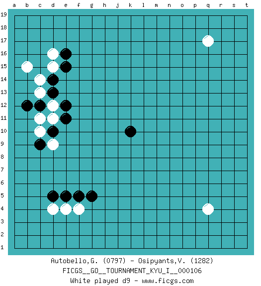 Last move : 0-1 2025 December 26 12:33:27 [Event "FICGS__GO__TOURNAMENT_KYU_I__000106"] [Site "FICGS"] [Date "2025.11.01"] [Round "1"] [Black "Autobello,Giovanni"] [White "Osipyants,Vladimir"] [Result "0-1"] [Rating 1 "0797"] [Rating 2 "1282"] 1.k10 d4 2.e5 d16 3.e15 d15 4.e16 q17 5.d5 e4 6.f5 f4 7.g5 c13 8.d14 c14 9.d13 d12 10.e12 d11 11.e11 q4 12.d10 c10 13.c12 c11 14.b12 b15 15.c9 d9 16.e10 b9 17.c8 b10 18.d8 b8 19.b7 b13 0-1 This go game has been lost on time (started : 2025.11.01 20:44:32) Follow this game move after move (download)Big groups never die. (Anonymous) Establishing goals is all right if you don't let them deprive you of interesting detours. (Doug Larson)
