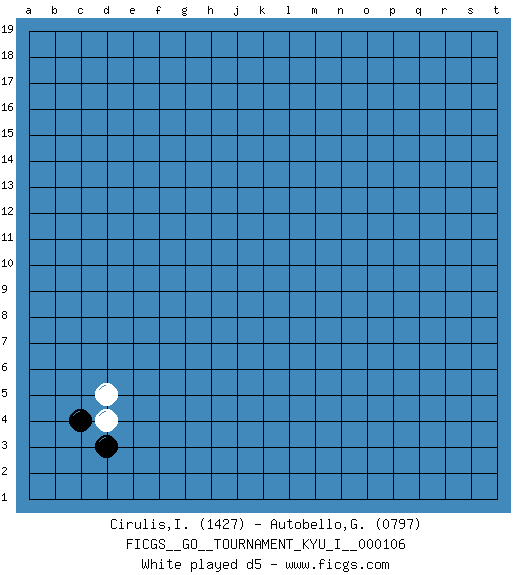 Last move : 1-0 2025 December 15 6:35:1 [Event "FICGS__GO__TOURNAMENT_KYU_I__000106"] [Site "FICGS"] [Date "2025.11.01"] [Round "1"] [Black "Cirulis,Ilmars"] [White "Autobello,Giovanni"] [Result "1-0"] [Rating 1 "1427"] [Rating 2 "0797"] 1.d3 d4 2.c4 d5 3.e3 c3 4.c5 c6 5.b3 c2 6.b6 b4 7.b5 a4 8.b2 c1 9.c7 d6 10.d7 e7 11.e6 f6 12.e5 1-0 This go game has been lost on time (started : 2025.11.01 20:44:32) Follow this game move after move (download)One point in the center is worth ten in the corner. (Anonymous) God, you are such an idiot. - Actually, I thought I was more of a jerk. (Gregory House to Stacy Warner, House M.D.)