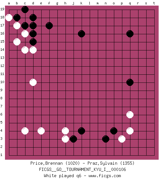 Last move : b18 2026 March 18 7:0:8 Player 1 - 25 days 07:36:07 Player 2 - 58 days 05:01:03 [Event "FICGS__GO__TOURNAMENT_KYU_I__000106"] [Site "FICGS"] [Date "2025.11.01"] [Round "1"] [Black "Price,Brennan"] [White "Praz,Sylvain"] [Result "*"] [Rating 1 "1020"] [Rating 2 "1355"] 1.q16 e4 2.d16 q4 3.k16 c4 4.q10 c14 5.f17 c16 6.c17 b17 7.d18 c18 8.d17 b15 9.d15 d14 10.b18 a18 11.c19 d10 12.k4 h3 13.j3 h4 14.n3 p3 15.o4 q6 16.o6 q8 17.p9 p8 18.n9 n8 19.o8 o7 20.o9 n7 21.n6 m6 22.m5 l7 23.l6 m7 24.k6 h7 25.k10 r16 26.r15 r17 27.q17 s15 28.r14 s14 29.r13 s13 30.q18 r12 31.q12 r11 32.q11 j14 33.l14 j16 34.k15 j15 35.j12 f14 36.j17 h17 37.h18 k13 38.l12 l13 39.m13 m12 40.m11 k17 41.j18 m14 42.n12 l15 43.l17 k14 44.l16 g12 45.h11 g11 46.h10 g10 47.h9 f8 48.h16 h15 49.g16 r10 50.p6 p7 51.p5 q5 52.m15 l14 53.n14 r18 54.r19 s19 55.q19 t18 56.h13 g15 57.f15 e15 58.f16 g13 59.g14 h14 60.k12 j2 61.k2 j4 62.k3 h2 63.j7 h6 64.j13 g14 65.g9 f9 66.b16 a16 67.c15 b16 68.a19 b19 69.e16 c18 70.e14 d19 71.e19 e13 72.c19 b18 73.* Follow this game move after move (download)You have to like to win, and to learn to recognize the errors that gave you the victory. (Pierre Audouard) Pushing plastic is for the many, pushing virtual pieces is for the fewer, pushing wood is for the very few. (Normajean Yates)