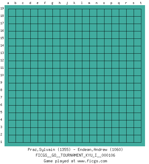 Last move : n6 2026 February 5 7:21:8 Player 1 - 20 days 13:46:21 Player 2 - 31 days 08:31:05 [Event "FICGS__GO__TOURNAMENT_KYU_I__000106"] [Site "FICGS"] [Date "2025.11.01"] [Round "1"] [Black "Praz,Sylvain"] [White "Endean,Andrew"] [Result "*"] [Rating 1 "1355"] [Rating 2 "1060"] 1.r16 p16 2.d4 d16 3.p17 q16 4.q17 o16 5.o17 n16 6.r15 l17 7.n17 m16 8.q4 r6 9.o3 q8 10.r10 q10 11.q11 p10 12.r9 q9 13.r8 r7 14.q12 p11 15.p12 o12 16.o13 n12 17.n13 m12 18.m13 l12 19.l13 k13 20.k14 j13 21.l15 l16 22.j14 h13 23.j16 h14 24.h17 c6 25.f3 d10 26.p6 p7 27.e6 g16 28.g17 f17 29.d9 e9 30.d8 e8 31.c10 d11 32.c11 d12 33.d7 f10 34.c12 c13 35.b13 c14 36.f18 e18 37.e17 f16 38.d18 e16 39.d17 h16 40.j17 j15 41.k15 h15 42.n6 * Follow this game move after move (download)There is death in the hane. (Anonymous) A shortcut is the longest distance between two points. (Don Groves)