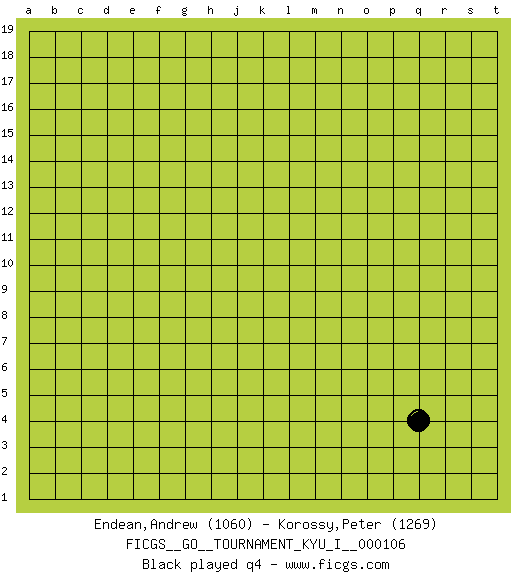Last move : k18 2026 March 19 18:23:38 Player 1 - 8 days 23:02:40 Player 2 - 61 days 17:16:48 [Event "FICGS__GO__TOURNAMENT_KYU_I__000106"] [Site "FICGS"] [Date "2025.11.01"] [Round "1"] [Black "Endean,Andrew"] [White "Korossy,Peter"] [Result "*"] [Rating 1 "1060"] [Rating 2 "1269"] 1.q4 d4 2.q16 d17 3.d15 c15 4.d16 c16 5.d13 e17 6.k16 o3 7.r6 l3 8.k4 l4 9.k3 g3 10.l5 m5 11.l6 q2 12.r3 r2 13.o5 n4 14.m6 k10 15.k7 k13 16.j14 j13 17.k14 g12 18.g13 f12 19.f13 d11 20.e12 e11 21.d12 j5 22.k5 h7 23.j6 h6 24.j4 h5 25.n5 n12 26.l13 l12 27.m13 m12 28.n13 p12 29.o12 o11 30.o13 p11 31.p13 p8 32.q8 q9 33.r8 r9 34.p7 o8 35.o7 m8 36.n7 n8 37.h13 h12 38.m4 m3 39.m5 s3 40.s4 s2 41.p3 p2 42.o4 n3 43.k2 l2 44.k1 h17 45.h15 c5 46.h8 j7 47.j8 k8 48.l8 k9 49.m7 r17 50.q17 r16 51.r15 s15 52.r14 s14 53.r13 r11 54.q12 s13 55.q11 q10 56.d8 c9 57.c8 d9 58.e9 g8 59.g9 f10 60.f9 f8 61.e8 h9 62.c11 d10 63.c10 b9 64.b10 b7 65.b8 a8 66.b12 b14 67.c14 b13 68.c13 r18 69.q18 q19 70.p19 r19 71.o18 l9 72.l7 k18 73.* Follow this game move after move (download)Everything happens on a grid-engraved board with black and white pieces, but if that's all you see then you don't know Go. (Pierre Audouard) There will be no order, only chaos. (Sol Robeson in Pi by Darren Aronofsky)