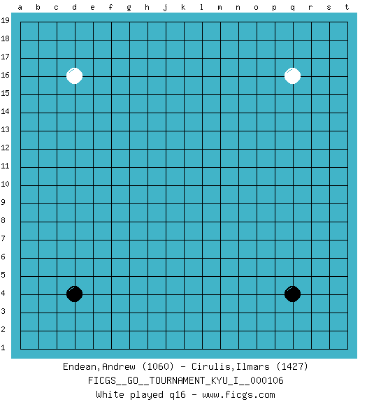 Last move : 0-1 2026 January 31 14:14:12 [Event "FICGS__GO__TOURNAMENT_KYU_I__000106"] [Site "FICGS"] [Date "2025.11.01"] [Round "1"] [Black "Endean,Andrew"] [White "Cirulis,Ilmars"] [Result "0-1"] [Rating 1 "1060"] [Rating 2 "1427"] 1.q4 d16 2.d4 q16 3.r14 k16 4.q10 s16 5.r12 o3 6.r6 f3 7.c6 l4 8.j4 d3 9.c3 c2 10.b4 e2 11.b2 e4 12.d5 e5 13.e6 f6 14.e7 f7 15.e8 k6 16.f8 c12 17.c10 q2 18.r3 k10 19.g7 h5 20.g6 f5 21.g5 g4 22.h6 j5 23.g8 c15 24.j6 k5 25.h4 h3 26.k7 l7 27.k8 l8 28.j9 k9 29.j8 n17 30.d12 d13 31.d11 e13 32.f12 f13 33.e12 g12 34.g11 h12 35.h11 j11 36.j10 k11 37.f10 p14 38.m9 n11 39.l9 o9 40.p8 o8 41.p9 p11 42.q11 o7 43.p7 o5 44.p5 o6 45.p6 p12 46.p10 o10 47.p13 o13 48.q13 p15 49.o4 n4 50.p4 p3 51.q3 r2 52.s3 b11 53.c11 b10 54.c9 b9 55.b8 s2 56.t3 s15 57.s14 t14 58.t13 t15 59.s12 b1 60.j13 h14 61.a2 c1 62.r15 r16 63.f17 g18 64.q12 b12 65.o14 n14 66.o15 n13 67.n15 m15 68.q14 o16 69.q15 p16 70.j12 l12 71.c17 b18 72.h13 g13 73.j14 h15 74.j3 h2 75.j2 l2 0-1 Follow this game move after move (download)If a formation is symmetrical, play at the center. (Anonymous) The real danger is not that computers will begin to think like men, but that men will begin to think like computers. (Sydney J. Harris)