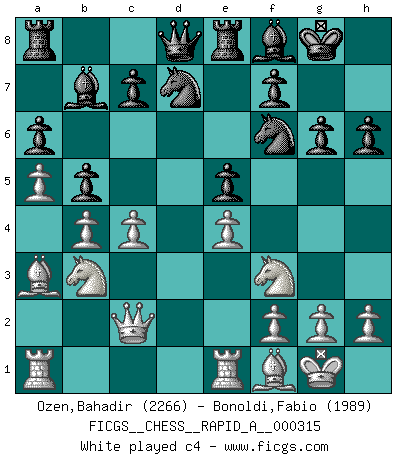Last move : 1/2-1/2 2026 January 3 22:25:20 [Event "FICGS__CHESS__RAPID_A__000315"] [Site "FICGS"] [Date "2025.11.03"] [Round "1"] [White "Ozen,Bahadir"] [Black "Bonoldi,Fabio"] [Result "1/2-1/2"] [WhiteElo "2266"] [BlackElo "1989"] 1.d4 g6 2.e4 Bg7 3.Nf3 d6 4.Be2 a6 5.O-O Nf6 6.Nbd2 O-O 7.a4 Re8 8.c3 e5 9.dxe5 dxe5 10.Qc2 b6 11.b4 Bb7 12.Re1 Nbd7 13.Ba3 h6 14.Bc4 Qe7 15.a5 b5 16.Bf1 Bf8 17.Nb3 Qd8 18.c4 c5 19.Nxc5 Nxc5 20.bxc5 b4 21.Bxb4 Rb8 22.Bc3 Qc7 23.Rab1 Nd7 24.Bd3 Nxc5 25.Qe2 Na4 26.Bd2 Bc6 27.Bc2 Rxb1 28.Rxb1 1/2-1/2 Follow this game move after move (download)Bobby Fischer's current state of mind is indeed a tragedy. One of the world's greatest Chess players - the pride and sorrow of American Chess. (Frank Brady) Je älter ich werde, um so mehr schätze ich die Bauern. (Paul Keres) Durante una competencia de Ajedrez, un Maestro de Ajedrez deberá ser una combinación de presa de caza y un Monge. (Alexander Alekhine) Les ravages du H expliquent la différence de niveau entre Tal et Thal [Abergel]. God, you are such an idiot. - Actually, I thought I was more of a jerk. (Gregory House to Stacy Warner, House M.D.)