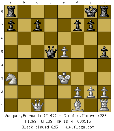 Last move : 1/2-1/2 2026 January 4 2:19:49 [Event "FICGS__CHESS__RAPID_A__000315"] [Site "FICGS"] [Date "2025.11.03"] [Round "1"] [White "Vasquez,Fernando"] [Black "Cirulis,Ilmars"] [Result "1/2-1/2"] [WhiteElo "2147"] [BlackElo "2284"] 1.e4 e5 2.Nf3 Nc6 3.d4 exd4 4.Nxd4 Bc5 5.Nb3 Bb6 6.Qe2 Nf6 7.e5 Nd5 8.c4 Ndb4 9.c5 Bxc5 10.Nxc5 Nd4 11.Qg4 Ndc2+ 12.Ke2 Kf8 13.Na3 d6 14.Qc4 b5 15.Qc3 Nxa1 16.Qxb4 dxc5 17.Qxb5 Be6 18.Qxc5+ Kg8 19.b3 Bxb3 20.axb3 Nxb3 21.Qc4 Nxc1+ 22.Qxc1 h5 23.Ke3 Qd5 24.f4 Rd8 25.Bc4 Qxg2 26.Rg1 Qxh2 27.Bxf7+ Kxf7 28.Qxc7+ Ke8 29.Qc6+ Kf8 30.Qc5+ Ke8 31.Qb5+ Kf8 32.Qc5+ Ke8 33.Qc6+ Kf8 34.Qc5+ 1/2-1/2 Follow this game move after move (download)Human affairs are like a Chess game: only those who do not take it seriously can be called good players. (Hung Tzu Ch'eng) Es hat in meinem Leben Zeiten gegeben, in denen das Schachspiel, wenn nicht zum Lebenszweck, so doch zu einem regelrechten Lebensersatz geworden ist. Man fühlt sich in solchen Zeiten nicht so, als besäße man eine göttliche Gabe, sondern eher so, als sei man von ihr besessen. (Garry Kasparov) El tablero es el mundo, las piezas es el fenomeno del universo, las reglas del juego son lo que llamamos leyes de la naturaleza y el jugador del lado opuesto, se encuentra oculto a nuestra vista. (Thomas Huxley) Dieu déplace le joueur, et celui-ci la pièce. Quel Dieu derrière Dieu commence donc la trame ? Arturo Perez-Reverte (prix de littérature policière 1993). A person who never made a mistake never tried anything new. (Albert Einstein)
