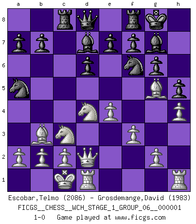 Last move : 1-0 2006 October 21 13:2:26 [Event "FICGS__CHESS__WCH_STAGE_1_GROUP_06__000001"] [Site "FICGS"] [Date "2006.07.01"] [Round "1"] [White "Escobar,Telmo"] [Black "Grosdemange,David"] [Result "1-0"] [WhiteElo "2086"] [BlackElo "1983"] 1.e4 c5 2.Nf3 Nc6 3.d4 cxd4 4.Nxd4 g6 5.Nc3 Bg7 6.Be3 Nf6 7.Bc4 O-O 8.Bb3 d6 9.f3 Bd7 10.h4 h5 11.Qd2 Rc8 12.O-O-O Na5 13.Bg5 1-0 This chess game has been lost on time (started : 2006.07.01 16:7:34) Sicilian : Accelerated Fianchetto, Modern variation with Bc4 Kingside Castling by player Black (move 7) Queenside Castling by player White (move 12) Player White won this chess game. Follow this game move after move (download)My style is somewhere between that of Tal and Petrosian. (Reshevsky) Die Partien sind immer verschieden, die Interviews immer die gleichen. (Garry Kasparov) Cuando tu casa esta en llamas, no puedes ser molestado por tus vecinos. O, como decinos en Ajedrez, si tu Rey esta bajo ataque, no te preocupa perder un Peón del lado de la Reina. (Gary Kasparov) Les ravages du H expliquent la différence de niveau entre Tal et Thal [Abergel]. To send light into the darkness of men's hearts - such is the duty of the artist. (Schumann)