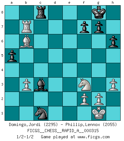 Last move : 1/2-1/2 2025 November 20 0:9:59 [Event "FICGS__CHESS__RAPID_A__000315"] [Site "FICGS"] [Date "2025.11.03"] [Round "1"] [White "Domingo,Jordi"] [Black "Phillip,Lennox"] [Result "1/2-1/2"] [WhiteElo "2295"] [BlackElo "2055"] 1.e4 e5 2.Nf3 Nc6 3.Bc4 Nf6 4.d4 exd4 5.e5 Ne4 6.Qe2 Nc5 7.c3 d3 8.Qe3 Be7 9.O-O d5 10.exd6 cxd6 11.Bxd3 Nxd3 12.Qxd3 O-O 13.Bf4 Qa5 14.Na3 Bf5 15.Qe2 Qa4 16.Bg3 d5 17.Nb5 Qe4 18.Nbd4 Qxe2 19.Nxe2 Bd3 20.Rfe1 Rfe8 21.h3 h6 22.Rad1 Bc4 23.b3 Bxe2 24.Rxe2 Bf6 25.Rc2 Rac8 26.Bd6 Red8 27.Ba3 a5 28.Bc5 d4 29.Bb6 d3 30.Rcd2 Bxc3 31.Rxd3 Rxd3 32.Rxd3 Nb4 33.Rd7 Nxa2 34.Rxb7 Nc1 1/2-1/2 Follow this game move after move (download)It is not a move, even the best move that you must seek, but a realizable plan. (Eugene Znosko-Borovsky) Im Schach gibt es keinen Platz für Galanterie. (Irving Chernev) Nunca nadie ha ganado una partida de Ajedrez rindiendose. (Unknown) La menace est plus forte que l'exécution. (Aaron Nimzovitch) There is a computer disease that anybody who works with computers knows about. It's a very serious disease and it interferes completely with the work. The trouble with computers is that you 'play' with them ! (Richard P. Feynman)