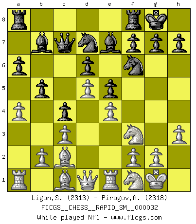 Last move : 1/2-1/2 2026 January 16 21:35:15 [Event "FICGS__CHESS__RAPID_SM__000032"] [Site "FICGS"] [Date "2025.11.03"] [Round "1"] [White "Ligon,Scott"] [Black "Pirogov,Andrey Mikhaylovich"] [Result "1/2-1/2"] [WhiteElo "2313"] [BlackElo "2318"] 1.e4 e5 2.Nf3 Nc6 3.Bb5 a6 4.Ba4 Nf6 5.O-O Be7 6.Re1 b5 7.Bb3 d6 8.c3 O-O 9.h3 Nb8 10.d4 Nbd7 11.Nbd2 Bb7 12.a4 c5 13.d5 c4 14.Bc2 Qc7 15.Nf1 Rab8 16.g4 bxa4 17.Rxa4 a5 18.Ra2 Nc5 19.Ng3 Nfd7 20.Kg2 Ba6 21.h4 Bc8 22.Be3 g6 23.h5 Nd3 24.Bxd3 cxd3 25.Rh1 Nf6 26.Nh2 Bd8 27.Bh6 Re8 28.Qf3 Qd7 29.Qxd3 Nxg4 30.Nxg4 Qxg4 31.hxg6 fxg6 32.b4 axb4 33.Ra7 Bh4 34.Rg7+ Kh8 35.cxb4 Re7 36.Rxe7 Bxe7 37.Qc3 Qd7 38.Nf1 Qg4+ 39.Ng3 1/2-1/2 Follow this game move after move (download)Of all my Russian books, the defense contains and diffuses the greatest 'warmth' which may seem odd seeing how supremely abstract Chess is supposed to be. (Vladimir Nabokov) Schach ist Kampf, hauptsächlich jedoch gegen die eigenen Fehler. (Savielly Grigorievitsch Tartakower) Con el fin de mejorar tu juego, debes de estudiar los finales antes que todo, ya que mientras que los finales pueden ser estudiados y dominados por sí mismos, el juegomedio y la apertura deben de ser estudiados en relación con los finales. (José Raúl Capablanca) Les Echecs mettent en conflit, non pas deux intelligences, mais deux volontés. (Lasker) Memory is a complicated thing, a relative to truth, but not its twin. (Barbara Kingsolver, Animal Dreams)